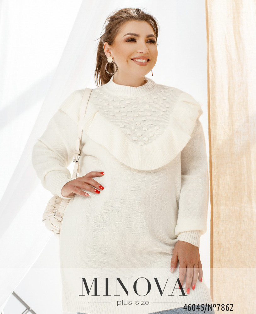 Женственный удлиненный свитер-туника привлекает внимание необычной фактурой и удобством. Модель с нежными вязаными оборками спереди груди поможет создать нежный образ в романтическом стиле.