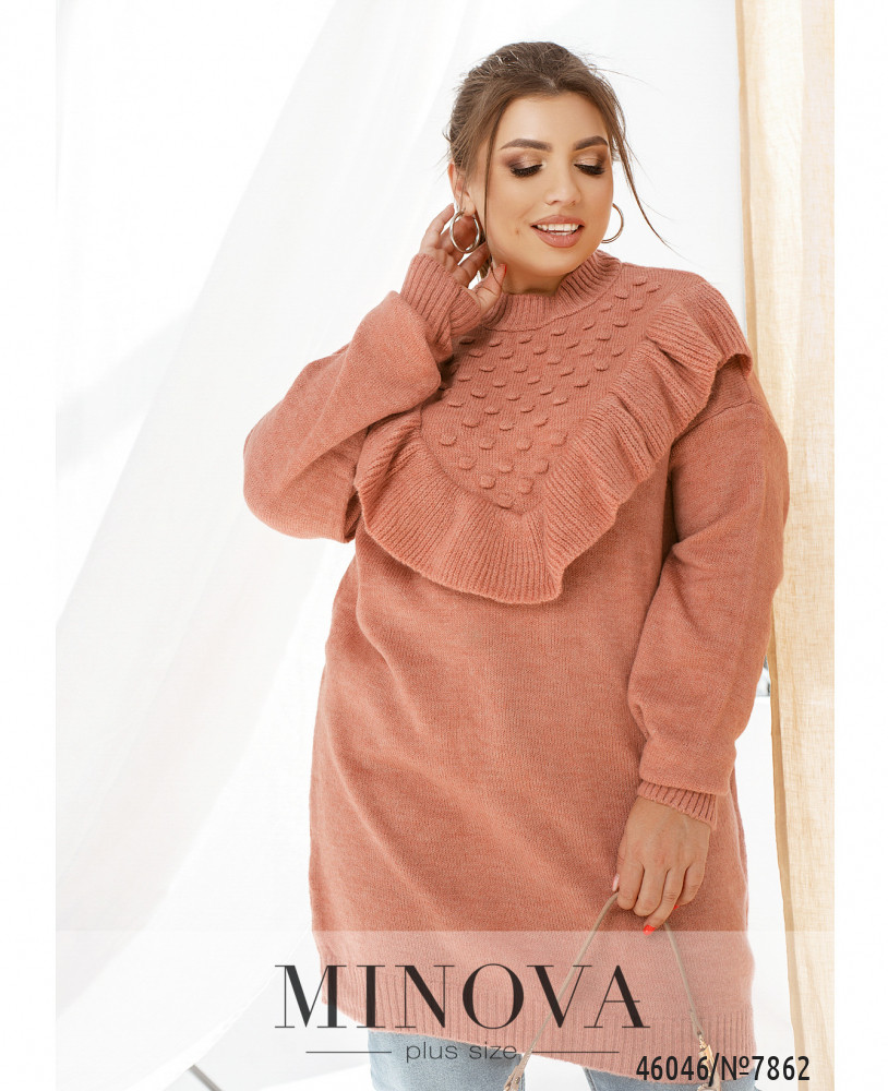 Женственный удлиненный свитер-туника привлекает внимание необычной фактурой и удобством. Модель с нежными вязаными оборками спереди груди поможет создать нежный образ в романтическом стиле.