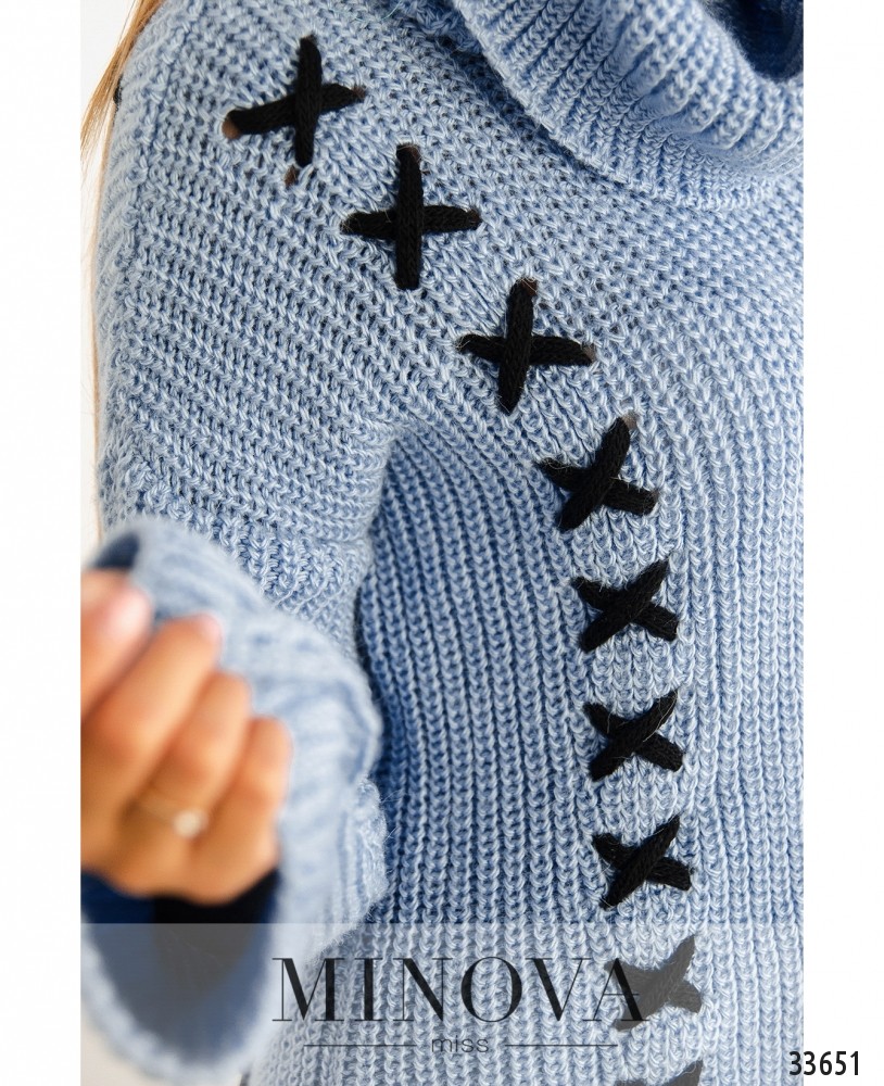 Не бойтесь экспериментировать с образами! Вязаный свитер в глубоких оттенках добавит настроения в привычный нейтральный гардероб. А эффектные детали в виде контрастной шнуровки и расклешенные рукава-колокола подчеркнут креативность Вашей натуры. Рукава подворачиваются в широкие манжеты. Широкий воротник-гольф и удлиненный на спине подол с разрезами дополнительно защищают от неуютного осеннего ветра.