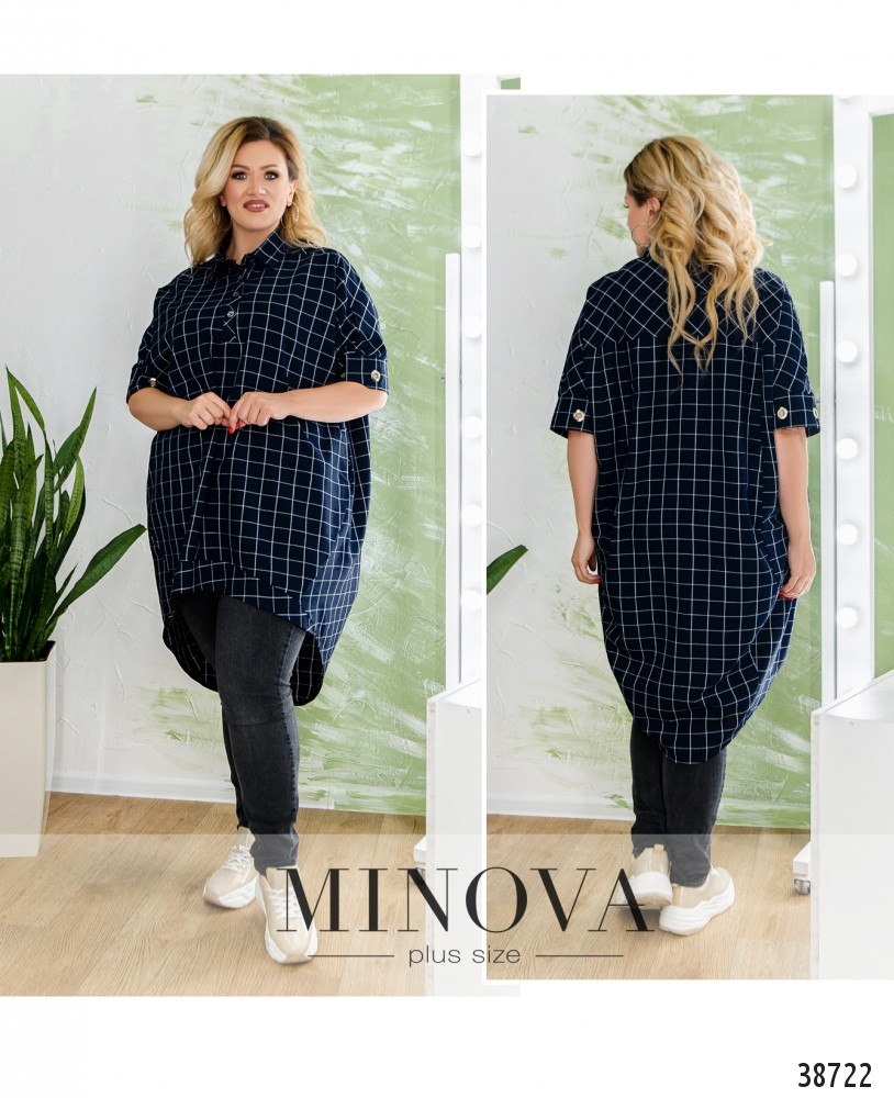 Лёгкая и удобная туника батал в клеточку, с отложным воротничком и рядом пуговиц на планке до середины груди. На рукавах - декоративные отверстия с люверсами на манжетах. Сзади на спинке - кокетка. По бокам - врезные карманы. Подол асимметричный благодаря декоративным швам.