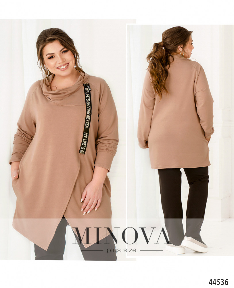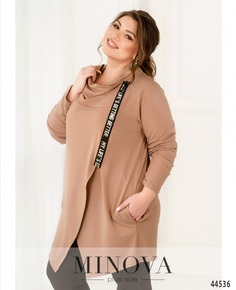 Элегантная и оригинальная туника батал, застёгивается на запАх, на одну пуговку изнутри и на диагональную молнию снаружи. Молния украшена декоративной лентой. Рукава без манжет, подкладки нет, по бокам - карманы в шве.