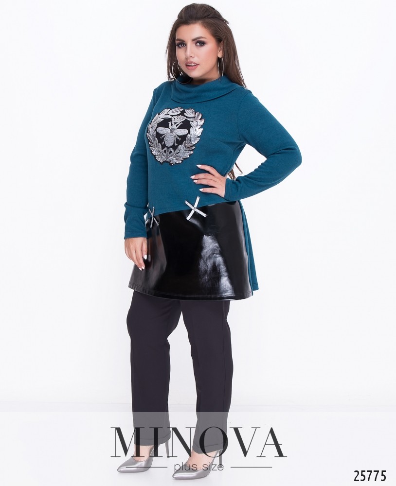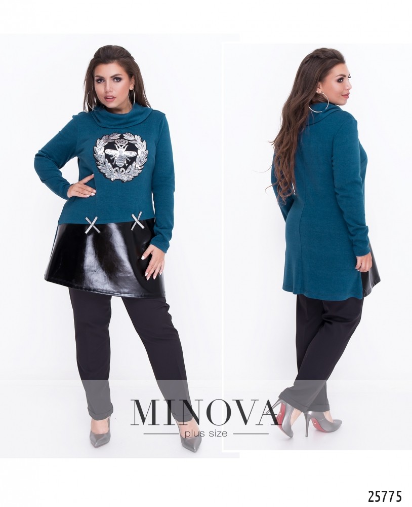 Удлинённая туника с комбинацией из эко-кожи и интересным рисунком из палеток в виде пчелы. Рукава полной длины, Ассиметричная вставка из эко-кожи расположена только в передней части изделия и декорирована яркими вставками. По горловине-небольшой цельный хомут. Перед изделия немного удлинен. Изделие без дополнительных застежек.