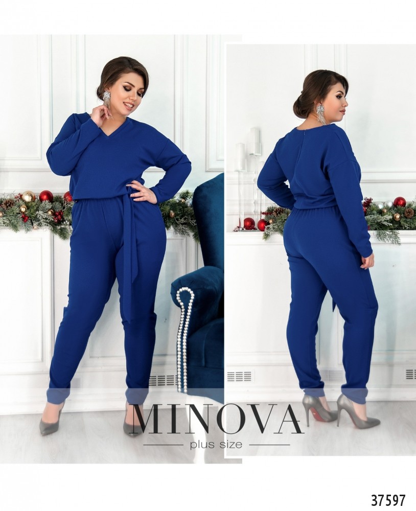 54 р-р: общая длина комбинезона 162см, длина рукава от горловины 71см, обхват рукава 46см, ОГ - 118см, длина брюк по внешнему шву с учетом пояса 78см, длина брюк комбинезона по внутреннему шву 105см, ОТ - 104см, ОБ - 124см.