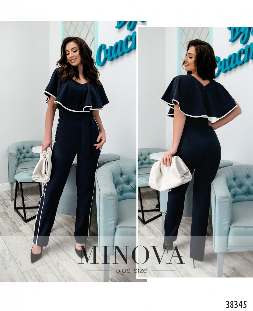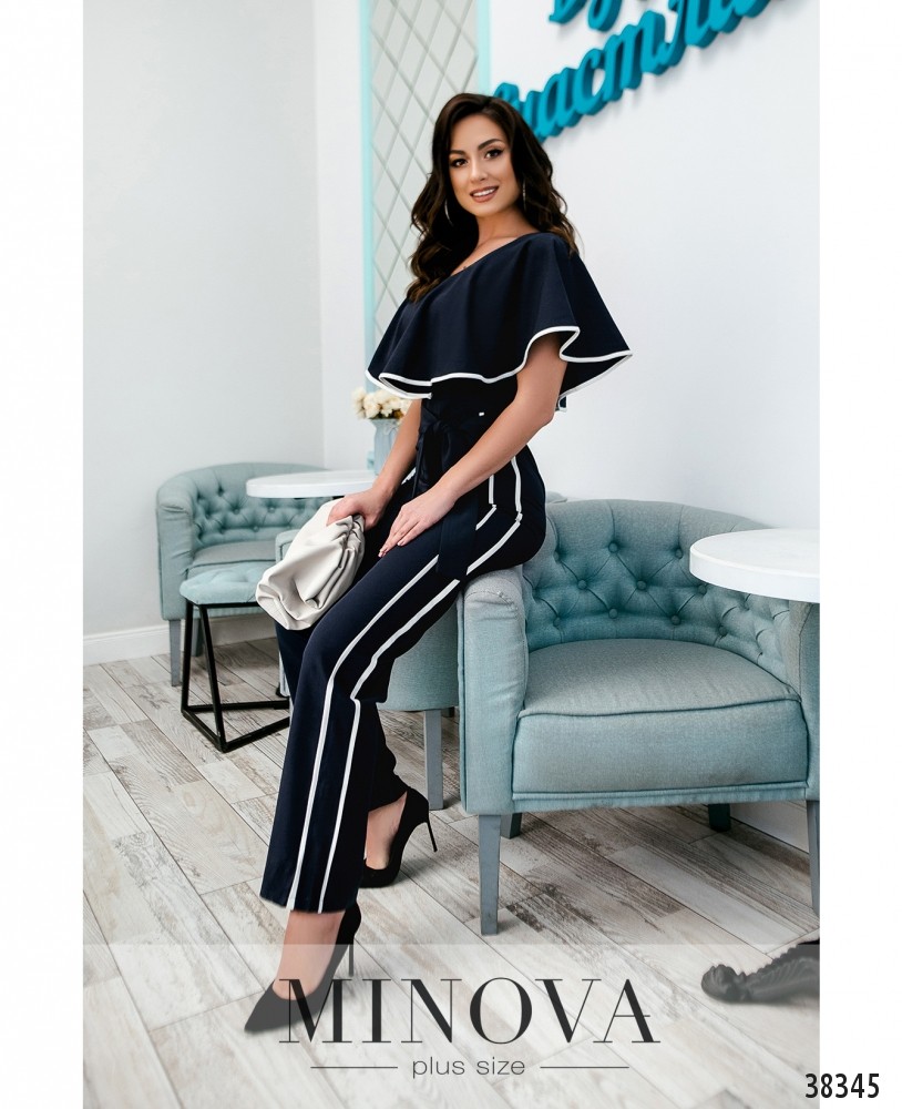 Очень женственный комбинезон с мягкими оборками, ниспадающими с плеч до талии и выполняющими роль рукавов. Оборки оторочены контрастной белой лентой, и такие же белые ленты – на брюках в качестве лампасов. Карманов нет, в комплекте пояс. Застёгивается на вшитую по спинке змейку. Вырез декольте широкий, глубокий.