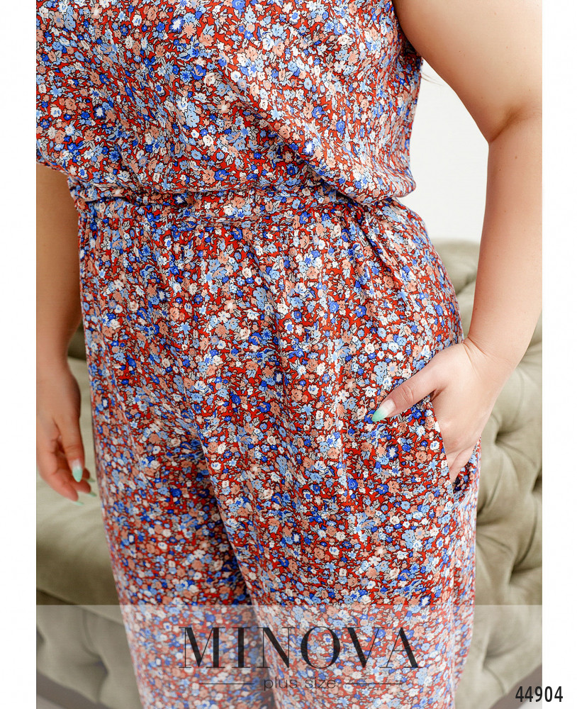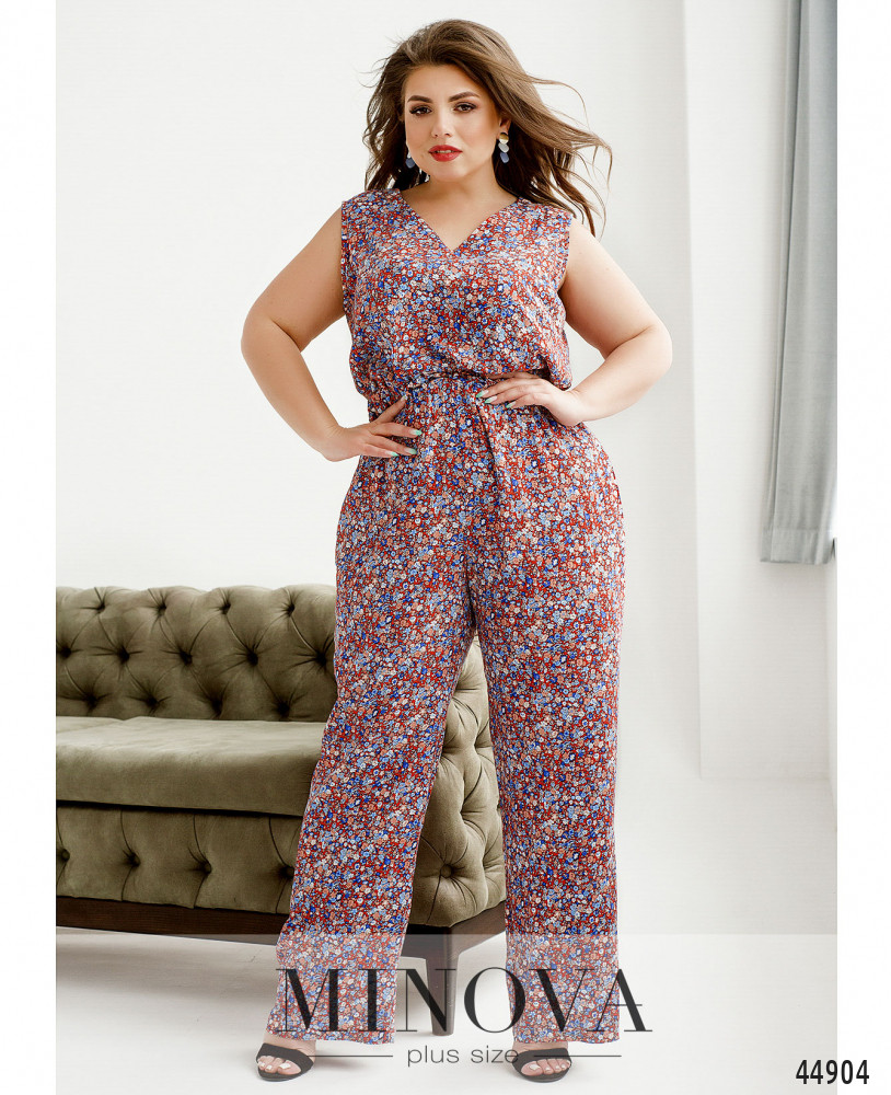Оригинальный комбинезон батал с V-образным неглубоким вырезом горловины, застёгивается на потайную молнию, вшитую по спинке. В пояс вшита плотная резинка, ткань лифа присобрана на талии. По бокам - карманы в шве.