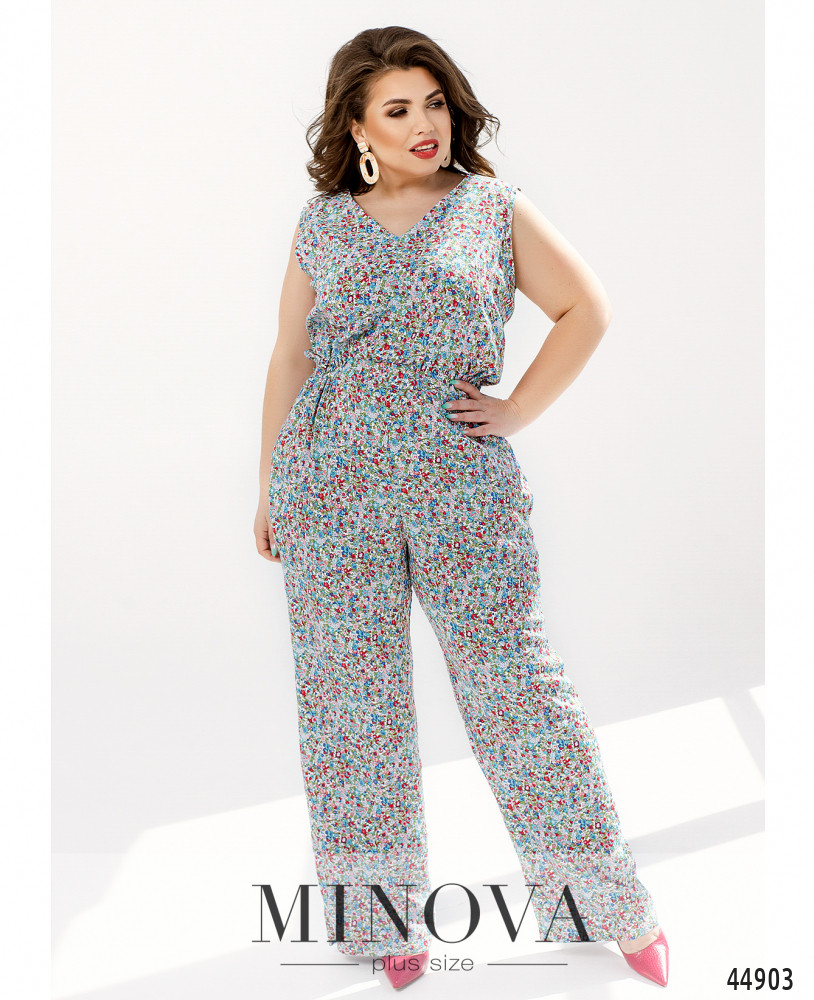 Оригинальный комбинезон батал с V-образным неглубоким вырезом горловины, застёгивается на потайную молнию, вшитую по спинке. В пояс вшита плотная резинка, ткань лифа присобрана на талии. По бокам - карманы в шве.