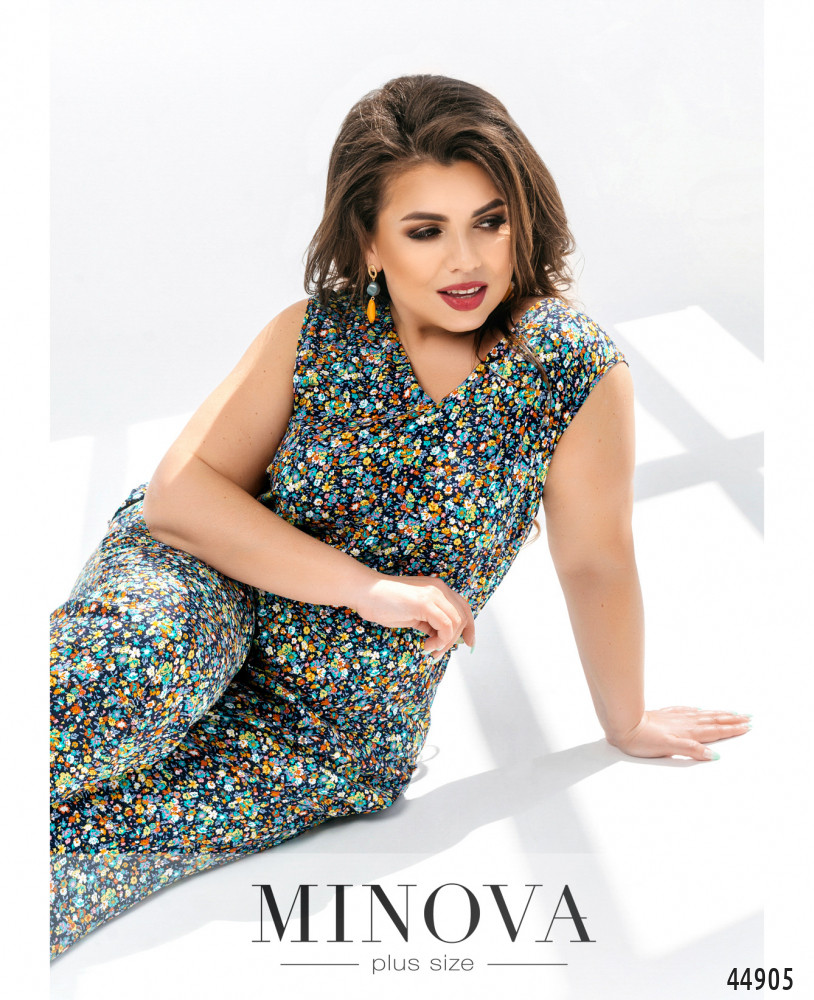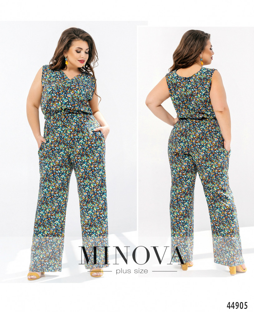 Оригинальный комбинезон батал с V-образным неглубоким вырезом горловины, застёгивается на потайную молнию, вшитую по спинке. В пояс вшита плотная резинка, ткань лифа присобрана на талии. По бокам - карманы в шве.