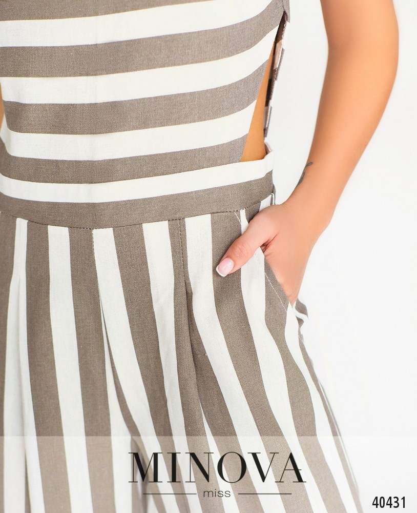Элегантный полосатый комбинезон с брюками, верх закрытый, по бокам на талии - оригинальные треугольные вырезы. Застёгивается на молнию, вшитую по спинке. На талии - небольшие декоративные складки. По бокам - врезные карманы. Вырез горловины полукруглый. На груди вытачки.