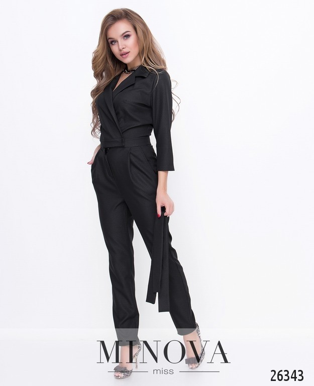 Стильный комбинезон, который подойдет как на повседневную носку, так и на праздничное мероприятие, в зависимости от аксессуаров. Топ на запах и с отложенным воротником, который крепиться на двух потайных пуговицах и дополняется поясом. Рукава ¾. Брюки зауженного кроя на молнии, по бокам два кармана.