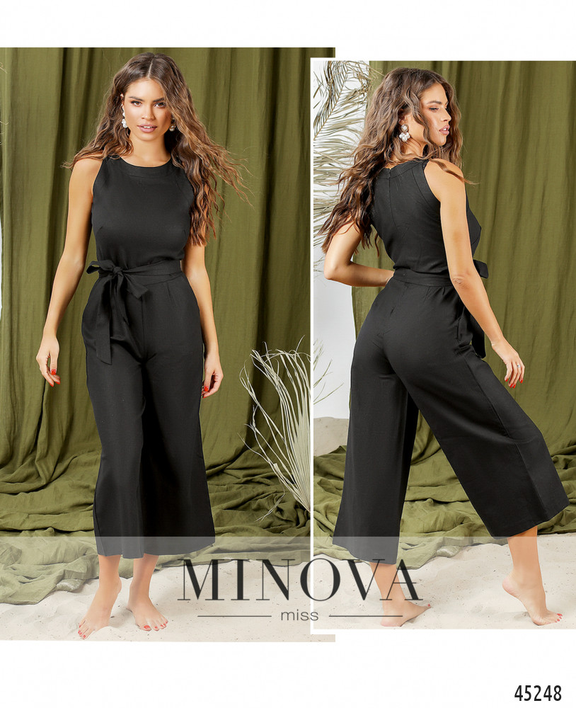 Минималистичный и очень привлекательный комбинезон с закрытым передом и спинкой, без рукавов, по бокам - врезные карманы, застёгивается на вшитую по спинке молнию. Брюки расклешённые. На груди - скульптурирующие вытачки.
