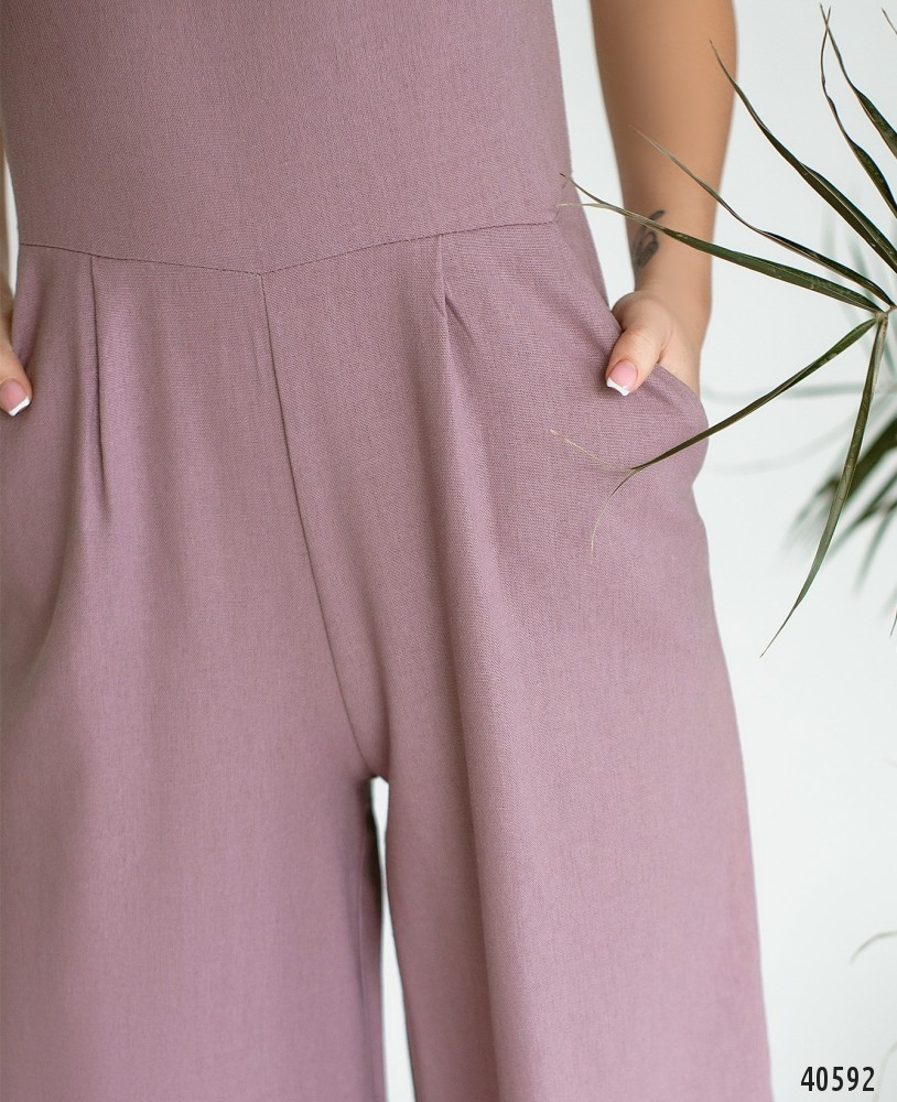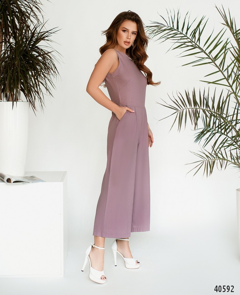 Минималистичный и очень привлекательный комбинезон с закрытым передом и спинкой, без рукавов, по бокам - врезные карманы, застёгивается на вшитую по спинке молнию. Брюки расклешённые. На груди - скульптурирующие вытачки.