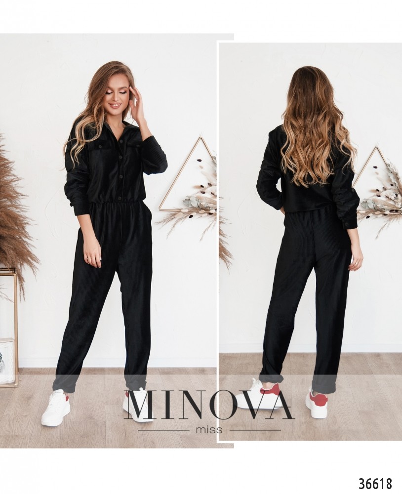 Очень уютный и привлекательный, мягкий комбинезон из свежего пополнения коллекции от Minova. Комбинезон из ткани, напоминающей вельвет. По бокам на груди – декоративные клапаны с пуговицами. Руква полной длины, регулируются с помощью ленты и пуговки, на манжетах также есть по одной пуговице. В талию вшита резинка, застёгивается на пуговицы от отложного воротничка до талии. Брюки прямого кроя. Прекрасный повседневный вариант, можно сочетать с разной обувью и аксессуарами.