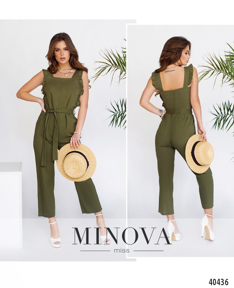 Нежный, очень удобный комбинезон с оборками на бретелях и до талии. В комплекте пояс. Застёгивается на молнию, вшитую по спинке. По бокам - врезные карманы, на груди вытачки. Пояс/аксессуар входит в комплект.