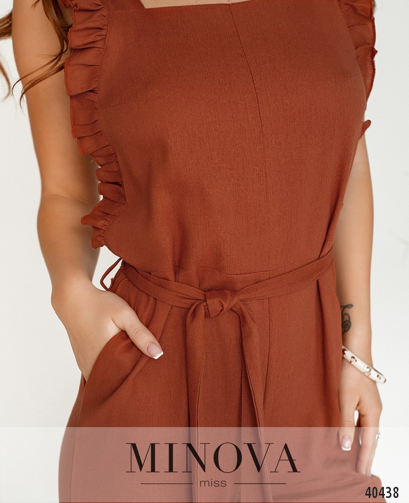 Нежный, очень удобный комбинезон с оборками на бретелях и до талии. В комплекте пояс. Застёгивается на молнию, вшитую по спинке. По бокам - врезные карманы, на груди вытачки. Пояс/аксессуар входит в комплект.