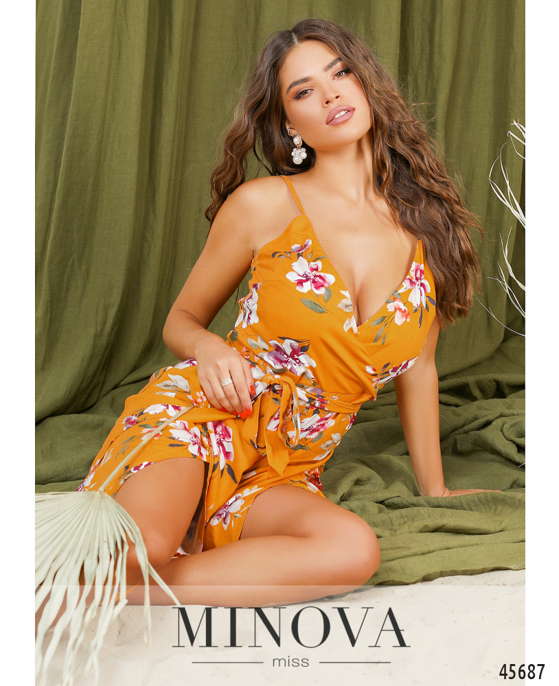 Стильный летний комбинезон с лифом на запАх, карманов нет, по бокам брючин - длинные разрезы, почти до бедра, но ткань прикрывает ноги при ходьбе. Слева сбоку вшита потайная молния. На груди - вытачки. Лямки не регулируются. Пояс входит в комплект.