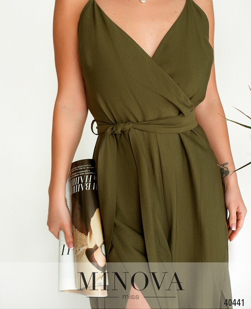 Элегантный комбинезон с подшитым на запАх верхом, застёгивается на молнию слева подмышкой. Бретели спереди широкие, по спине тонкие, с регулировкой. Брюки расклешены за счёт оригинальных вставок по бокам. В комплекте пояс. На груди вытачки.