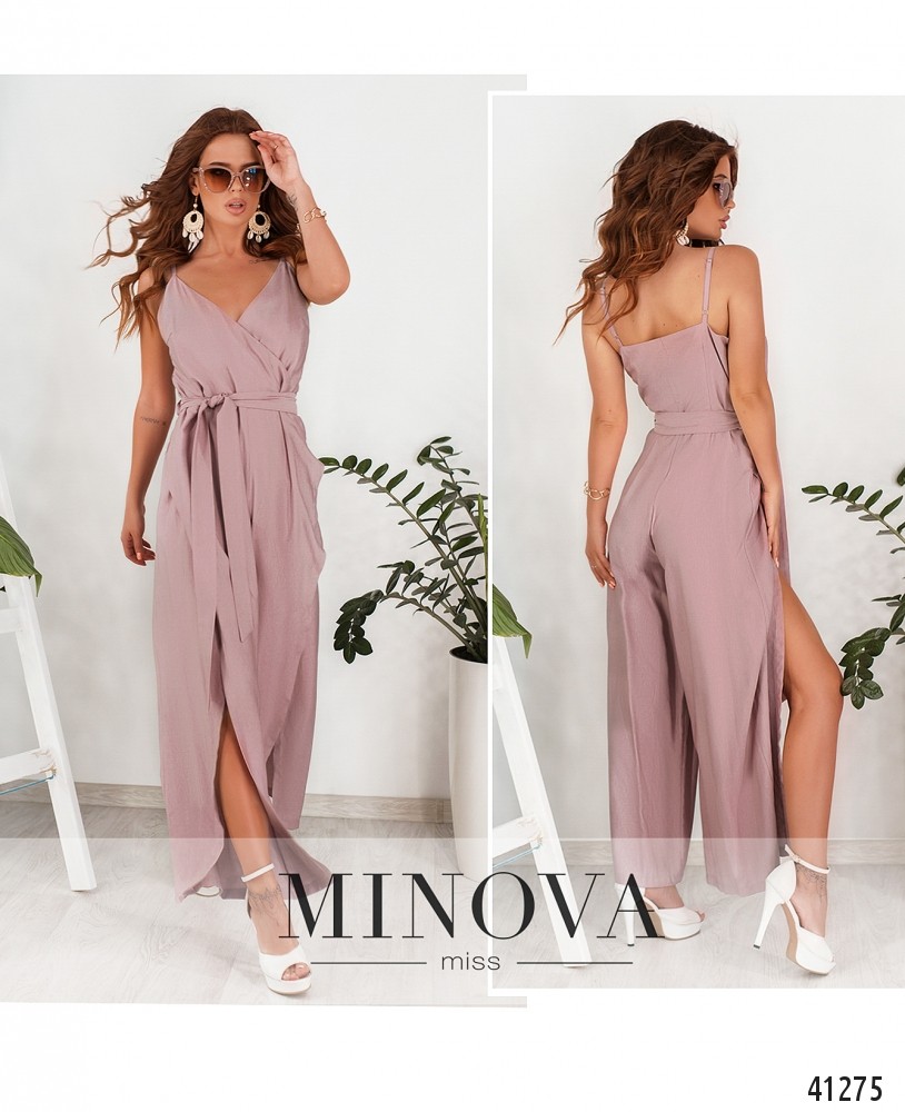 Стильный летний комбинезон с лифом на запАх, карманов нет, по бокам брючин - длинные разрезы, почти до бедра, но ткань прикрывает ноги при ходьбе. Слева сбоку вшита потайная молния. На груди - вытачки. Лямки не регулируются.