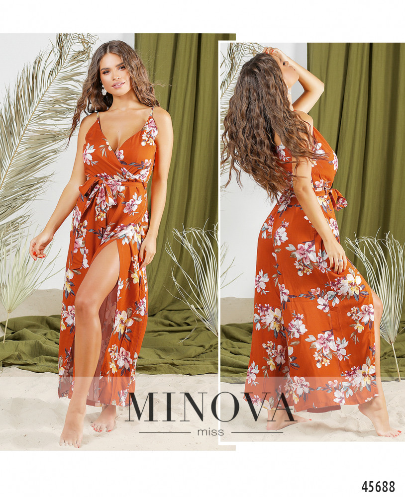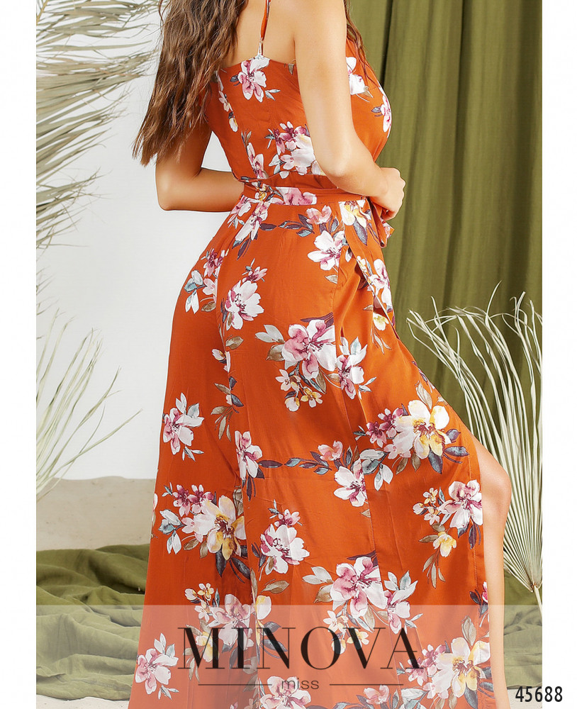 Стильный летний комбинезон с лифом на запАх, карманов нет, по бокам брючин - длинные разрезы, почти до бедра, но ткань прикрывает ноги при ходьбе. Слева сбоку вшита потайная молния. На груди - вытачки. Лямки не регулируются. Пояс входит в комплект.