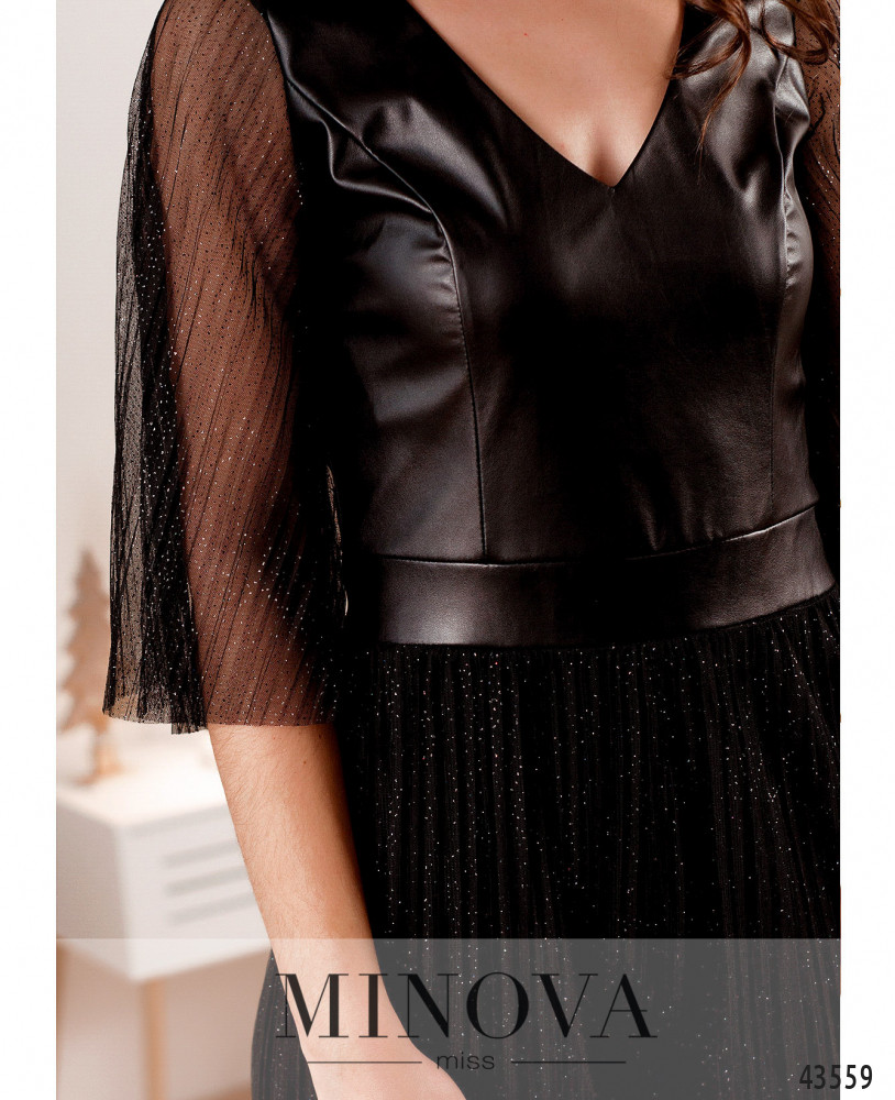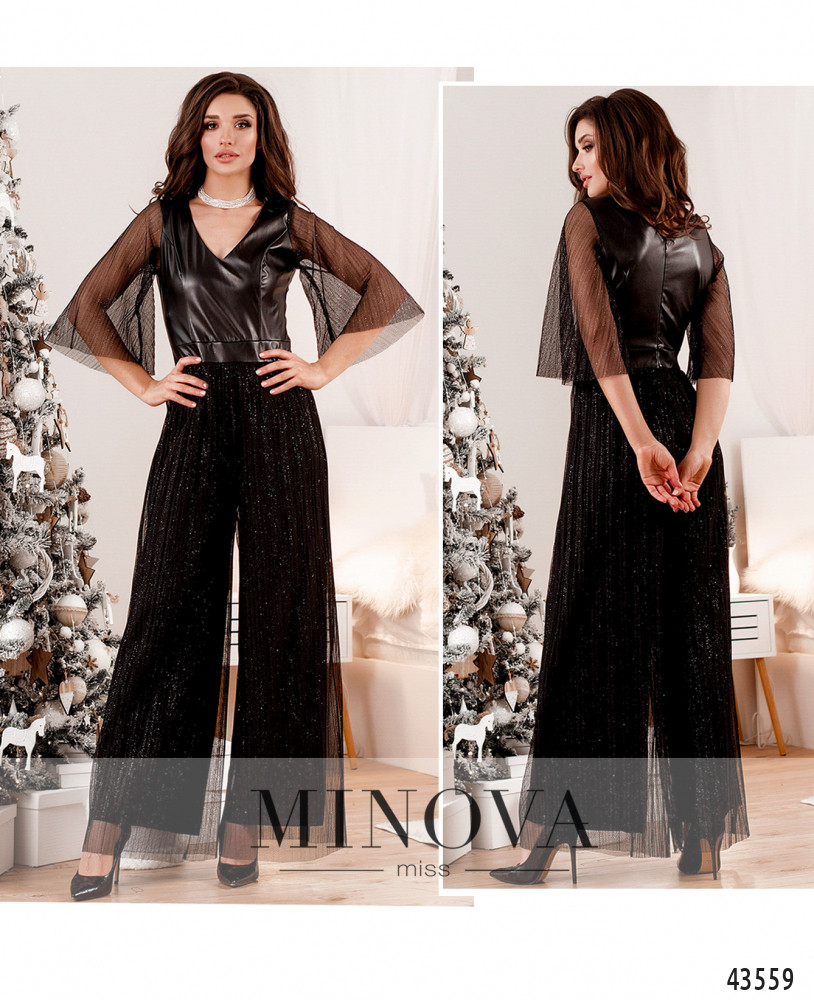 Оригинальный комбинезон с двойными брюками - нижняя ткань мягкая, верхняя прозрачная, воздушная. Рукава полупрозрачные, без подкладки, расклешены. Вырез горловины V-образный. Застёжка - вшитая по спинке молния. Карманов нет. Лиф из эко-кожи с продольными скруглёнными вытачками.