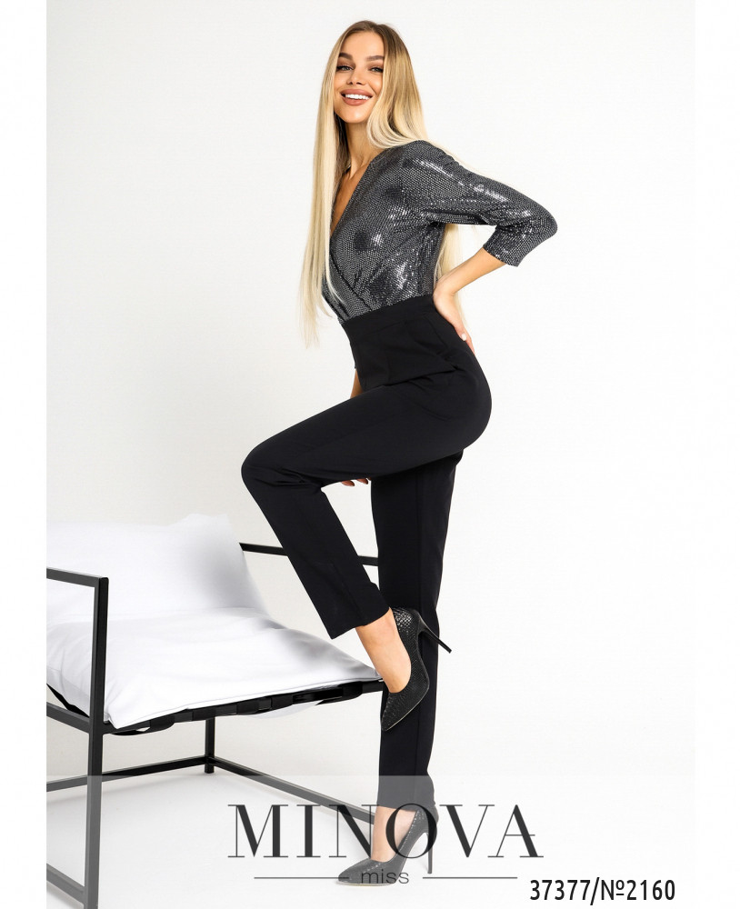 Нарядный приталенный комбинезон с длинными брюками. Верх подшит на запАх и декорирован пайетками спереди и по спине. Рукава с пайетками. По бокам – прорезные карманы, застёжка – потайная молния на спине. Сзади продольные вытачки.