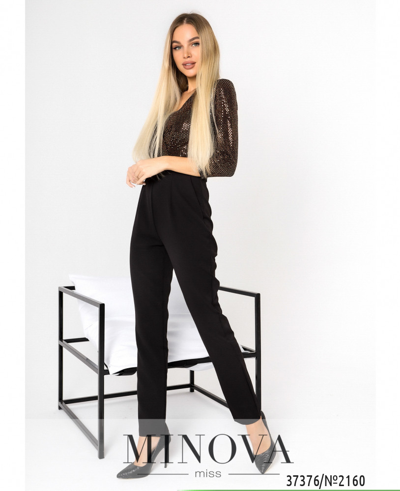 Нарядный приталенный комбинезон с длинными брюками. Верх подшит на запАх и декорирован пайетками спереди и по спине. Рукава с пайетками. По бокам – прорезные карманы, застёжка – потайная молния на спине. Сзади продольные вытачки.