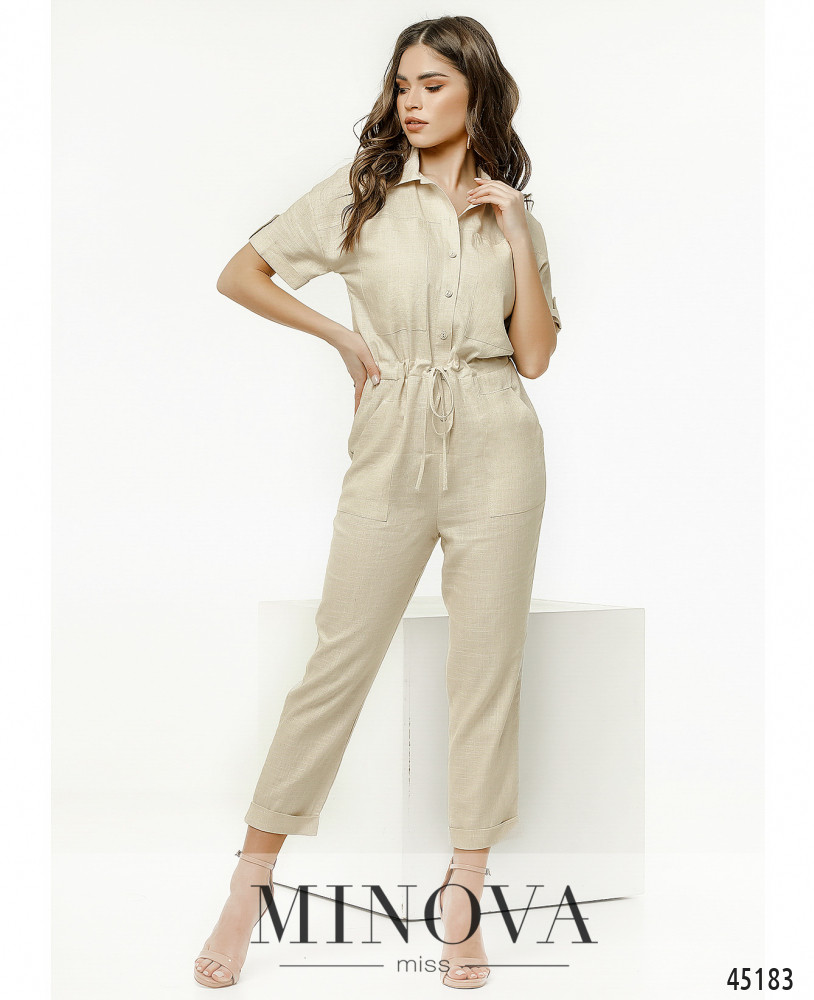Стильный комбинезон с отложным воротничком и короткими спущенными рукавами с отворотами выручит вас в тех случаях, когда совсем нет времени. С ним вы можете создавать лаконичные образы, дополнив его спортивными кедами или босоножками на каблуках. Накладные карманы в области груди и бедер и застежка на пуговицах спереди делают его максимально комфортным.  А, благодаря декоративному шнурку в области талии, вы решаете, какой силуэт подходит вам больше сегодня - свободный или приталенный.