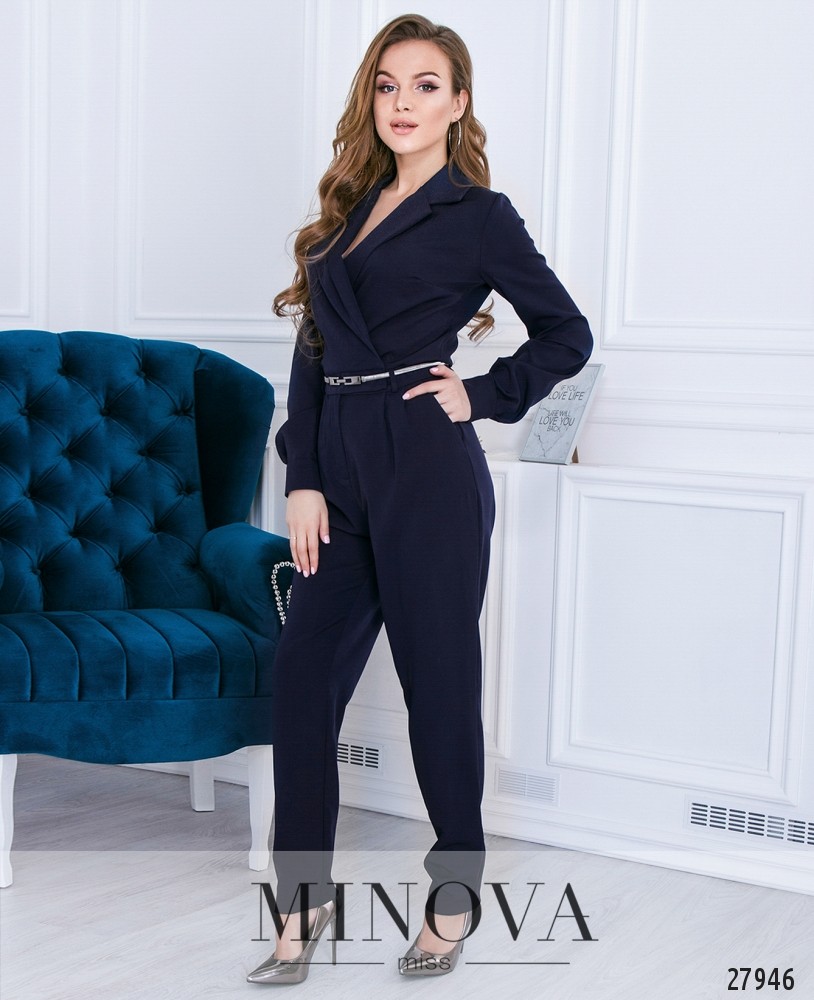 Элегантный комбинезон с металлическим съемным поясом в комплекте. Комбинезон отрезной от талии с зауженными штанинами. Лиф на запАх с отложным воротником застегивается на внутренней и внешней стороне на пуговицы в поясе. Рукава собраны в манжеты, которые застегиваются на две пуговицы. Линия пояса дополнена шлевками и боковыми защипами. Штанины с карманами с ширинкой на молнии.