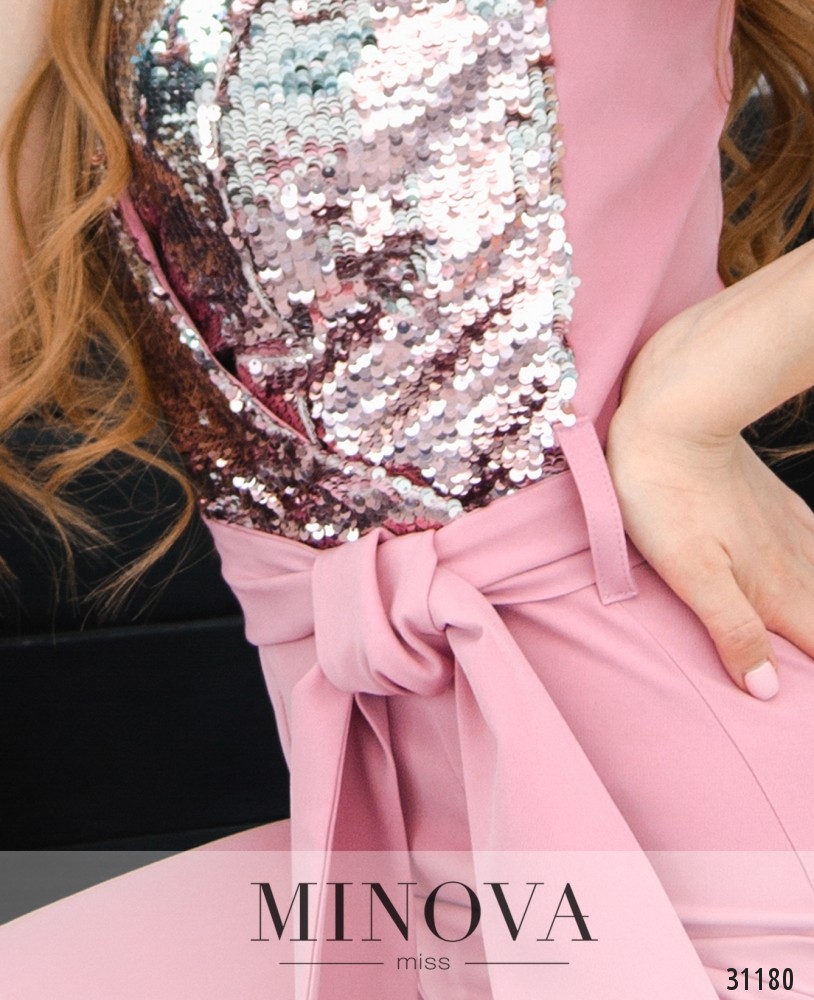 Коктейльный комбинезон со сверкающим лифом и расклешенными штанинами. Эффектный лиф на запАх расшит двухцветными пайетками. Комбинезон с завышенной линией талии оформлен съемным поясом в тон и шлевками для пояса. На спине комбинезон застегивается на скрытую молнию.