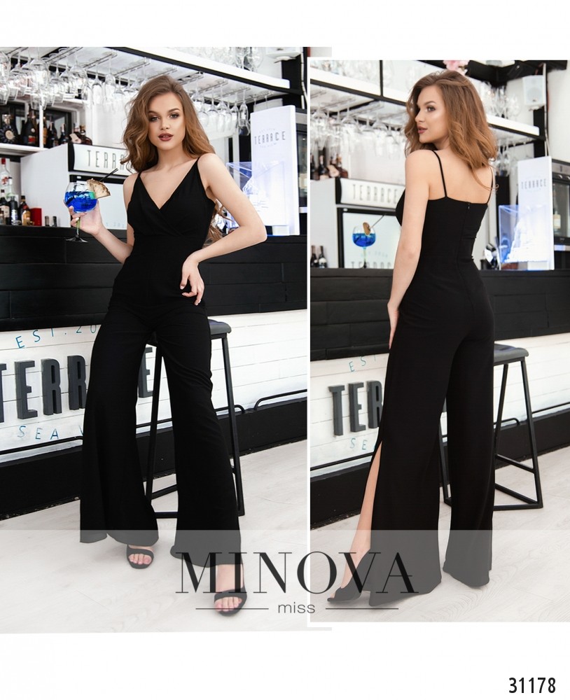 Коктейльный шифоновый комбинезон с расклешенными штанинами. Комбинезон с завышенной линией талии оформлен поясом-вставкой. Драпированный лиф с V-образным декольте на запАх. Свободные штанины оформлены интригующими разрезами. На спине комбинезон застегивается на скрытую молнию.