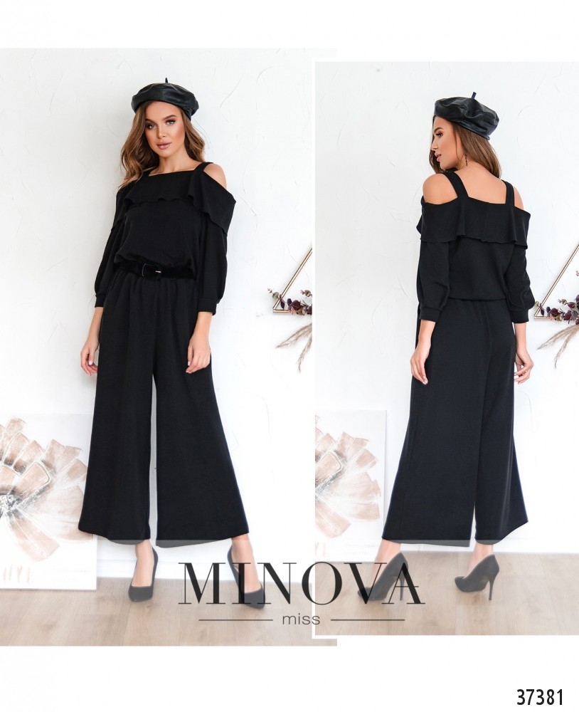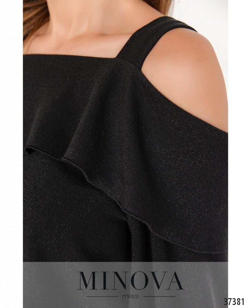 Романтичный комбинезон с широкими лямками и открытыми плечами. На груди – мягкие оборки. По бокам – врезные карманы. Брюки расклешены от бедра. Рукава с мягкими манжетами без пуговиц. Ткань мягкая, плотная, с люрексом.