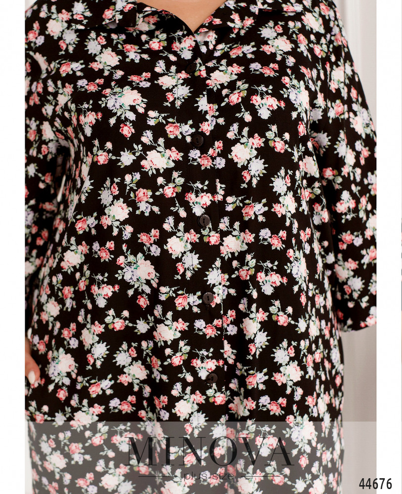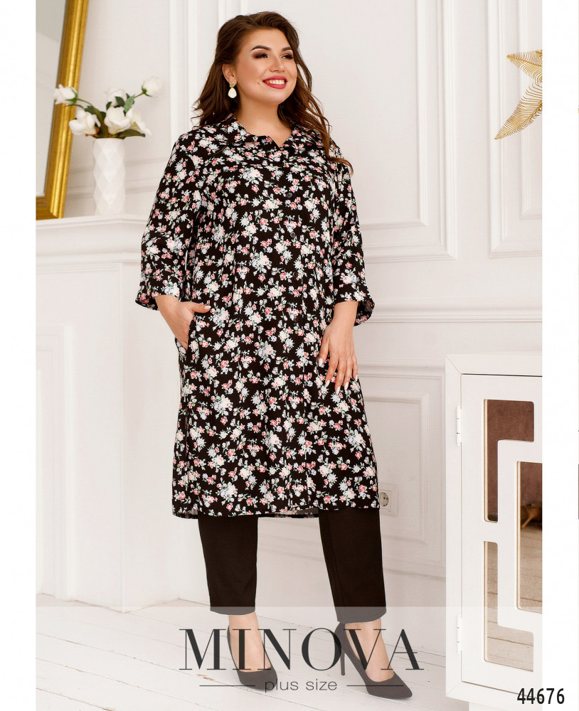 Элегантный костюм батал, рубашка длинная, рукава с мягкими манжетами, по бокам - карманы в шве, застёгивается на ряд пуговиц от отложного воротничка до низу. Брюки без застёжек, по бокам карманы в шве, посадка высокая, в пояс вшита резинка. Пояс/аксессуар входит в комплект.
