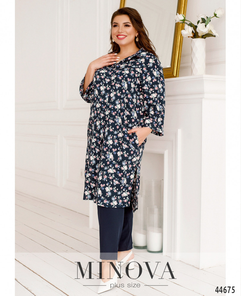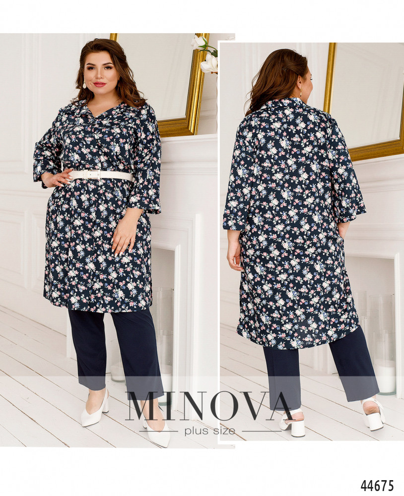 Элегантный костюм батал, рубашка длинная, рукава с мягкими манжетами, по бокам - карманы в шве, застёгивается на ряд пуговиц от отложного воротничка до низу. Брюки без застёжек, по бокам карманы в шве, посадка высокая, в пояс вшита резинка. Пояс/аксессуар входит в комплект.
