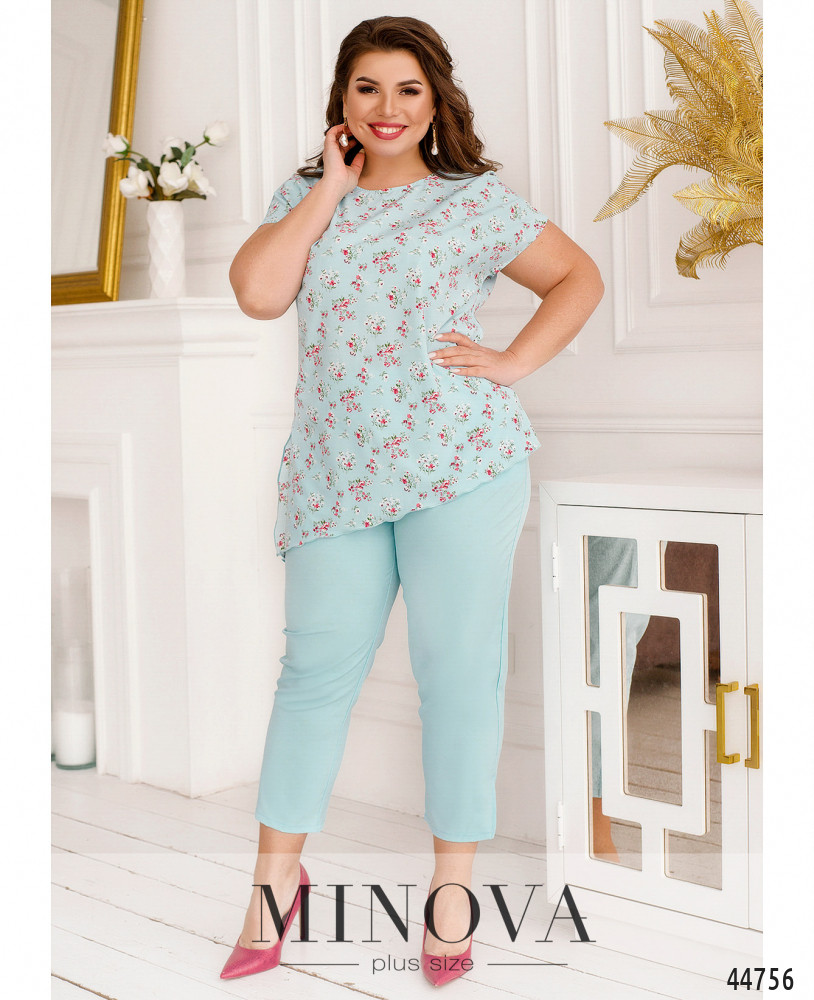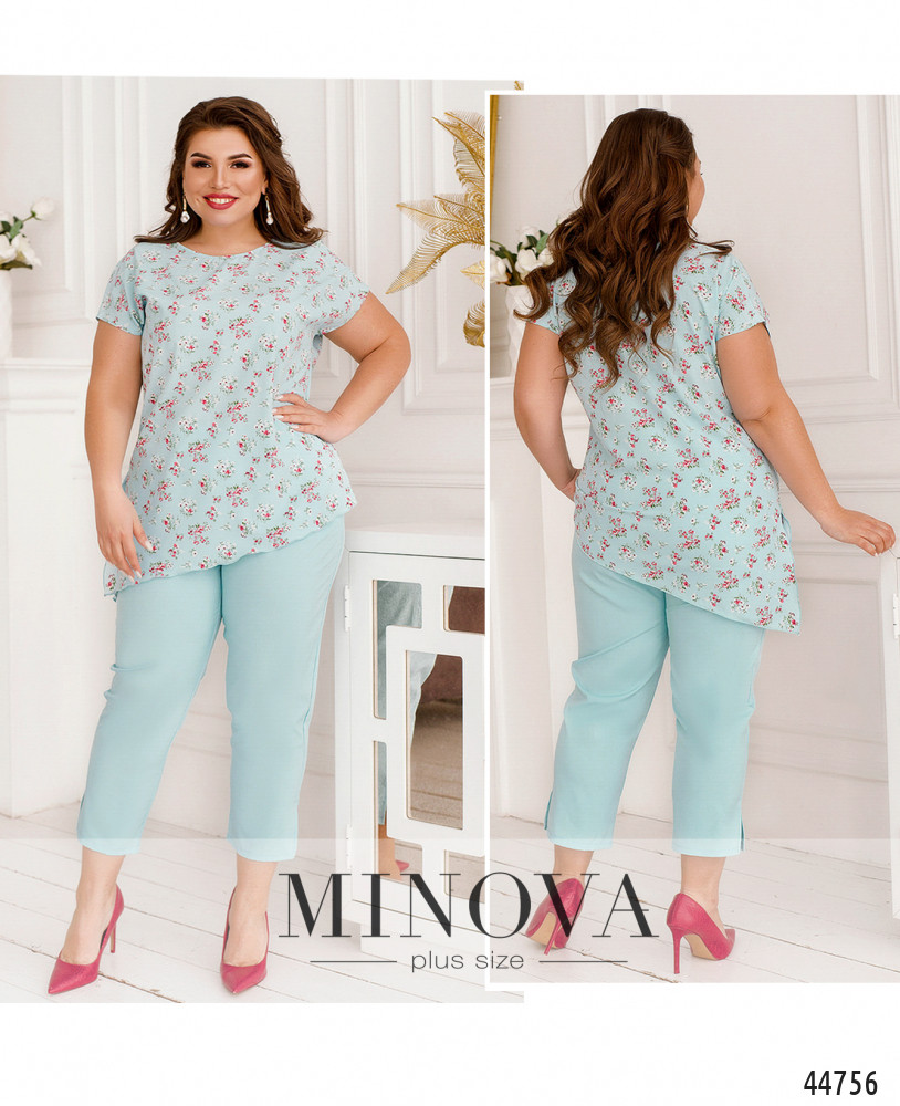 Оригинальный костюм плюс сайз, блуза с асимметричным подолом и ярким принтом, без карманов и застёжек, справа на подоле небольшой разрез. Рукава короткие фасона "летучая мышь". Вырез горловины полукруглый. Брюки с высокой талией, без застёжек, по бокам - карманы в шве, в пояс вшита резинка.
