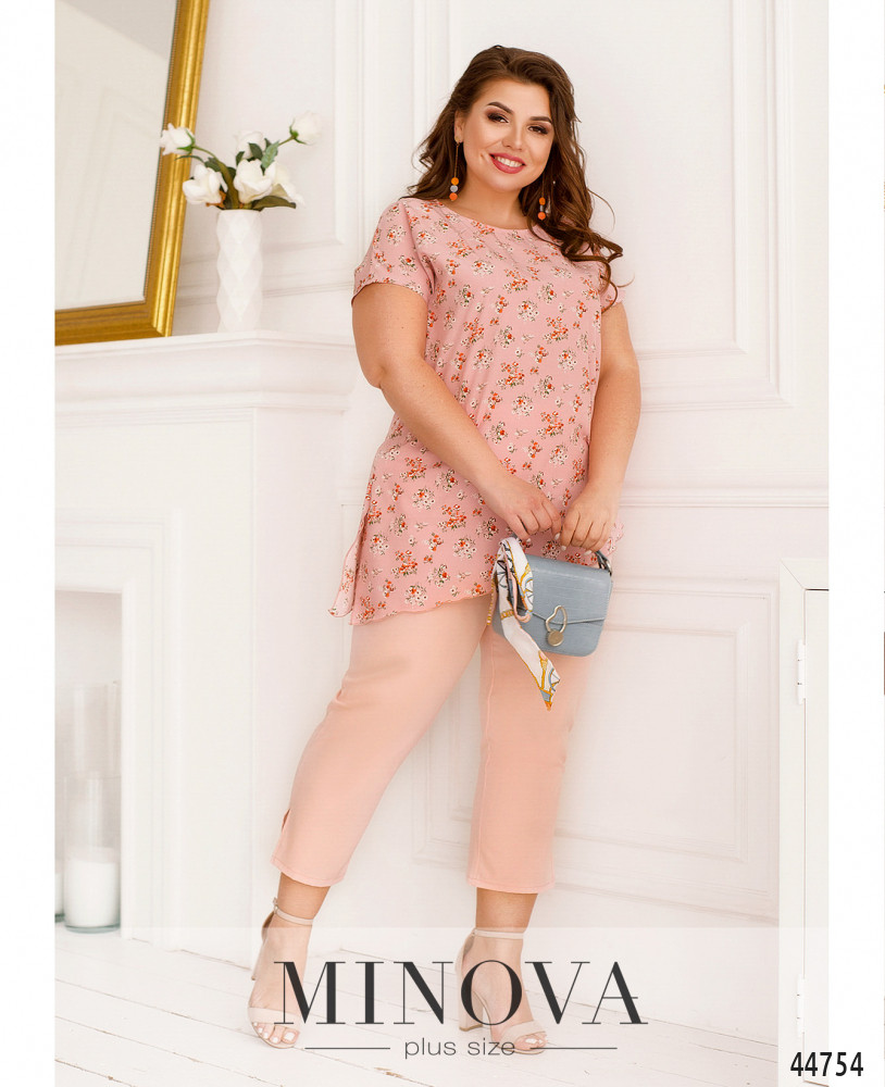 Оригинальный костюм плюс сайз, блуза с асимметричным подолом и ярким принтом, без карманов и застёжек, справа на подоле небольшой разрез. Рукава короткие фасона "летучая мышь". Вырез горловины полукруглый. Брюки с высокой талией, без застёжек, по бокам - карманы в шве, в пояс вшита резинка.