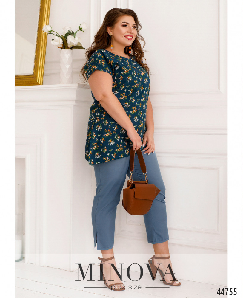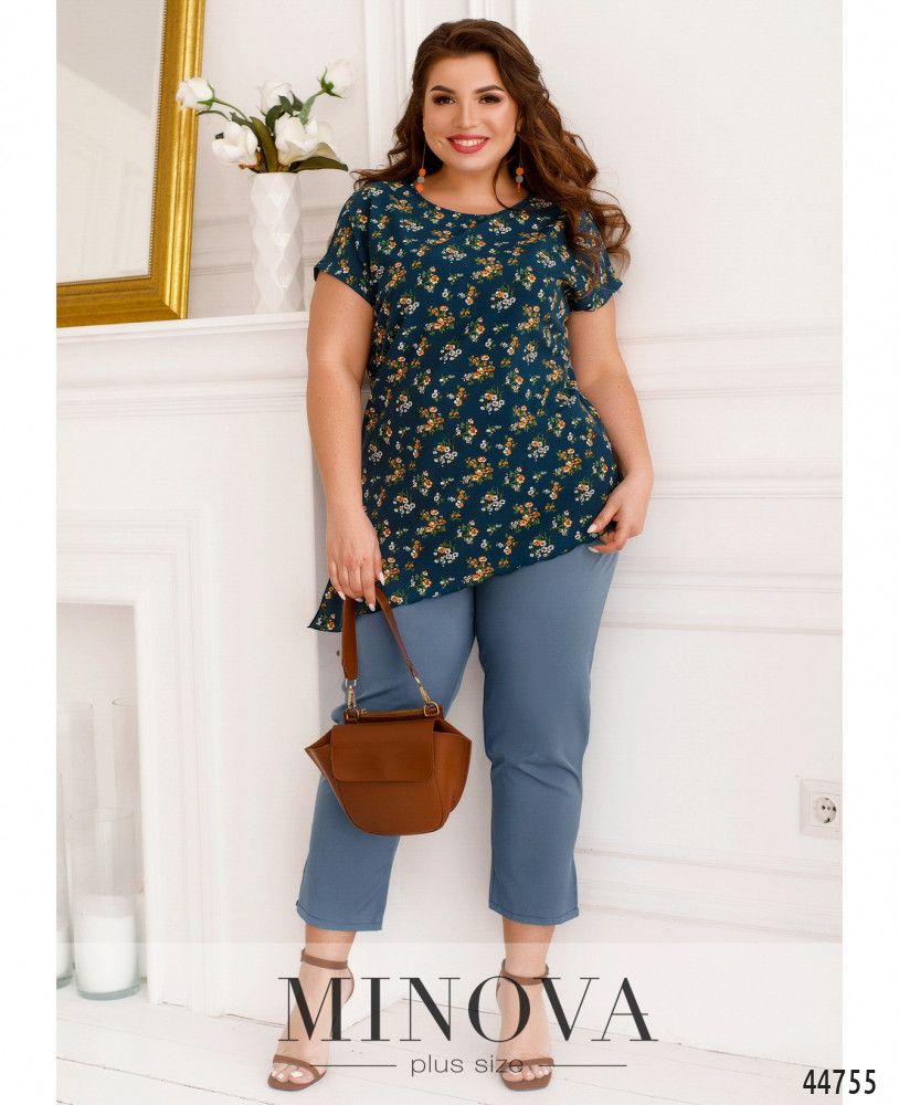 Оригинальный костюм плюс сайз, блуза с асимметричным подолом и ярким принтом, без карманов и застёжек, справа на подоле небольшой разрез. Рукава короткие фасона "летучая мышь". Вырез горловины полукруглый. Брюки с высокой талией, без застёжек, по бокам - карманы в шве, в пояс вшита резинка.