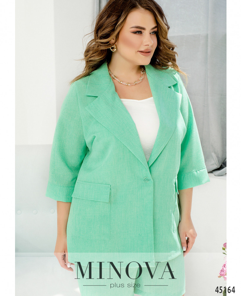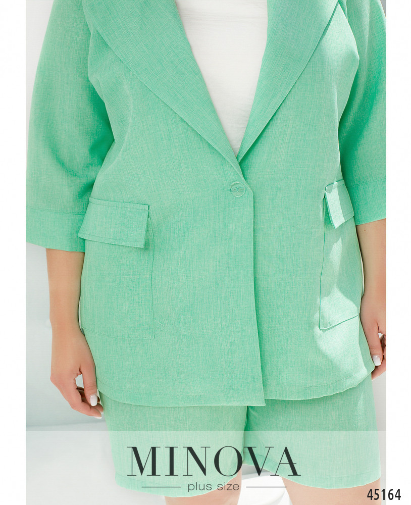 Минималистичный однотонный костюм с пиджаком и шортами - идеальное решение для лета. Классический жакет с лацканами, рукавами 3/4 и накладными карманами застегивается на одну пуговицу. Его дополняют лаконичные шорты с карманами и резинкой в задней части пояса.
