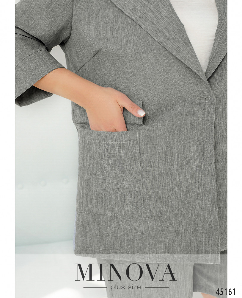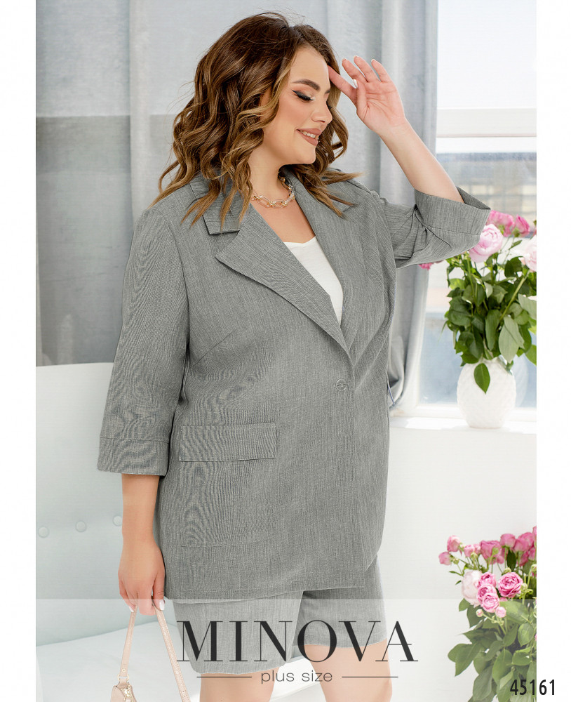 Минималистичный однотонный костюм с пиджаком и шортами - идеальное решение для лета. Классический жакет с лацканами, рукавами 3/4 и накладными карманами застегивается на одну пуговицу. Его дополняют лаконичные шорты с карманами и резинкой в задней части пояса.
