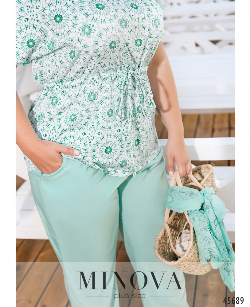 Стильный контрастный костюм из легкой ткани с блузой и брюками. Однотонные классические брюки на резинке с карманами в швах гармонично дополнены светлой блузой со спущенными рукавами и принтом в тон брюк. Благодаря тонкому пояску, пропущенному через талию, одним движением силуэт блузы меняется от прямого к приталенному. Пояс НЕ входит в комплект.