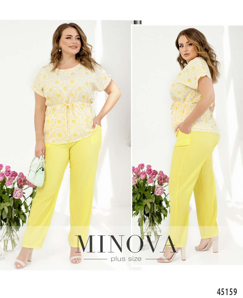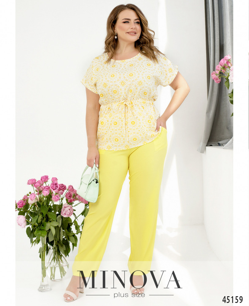 Стильный контрастный костюм из легкой ткани с блузой и брюками. Однотонные классические брюки на резинке с карманами в швах гармонично дополнены светлой блузой со спущенными рукавами и принтом в тон брюк. Благодаря тонкому пояску, пропущенному через талию, одним движением силуэт блузы меняется от прямого к приталенному.