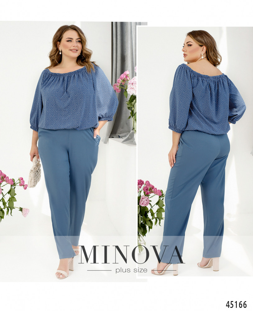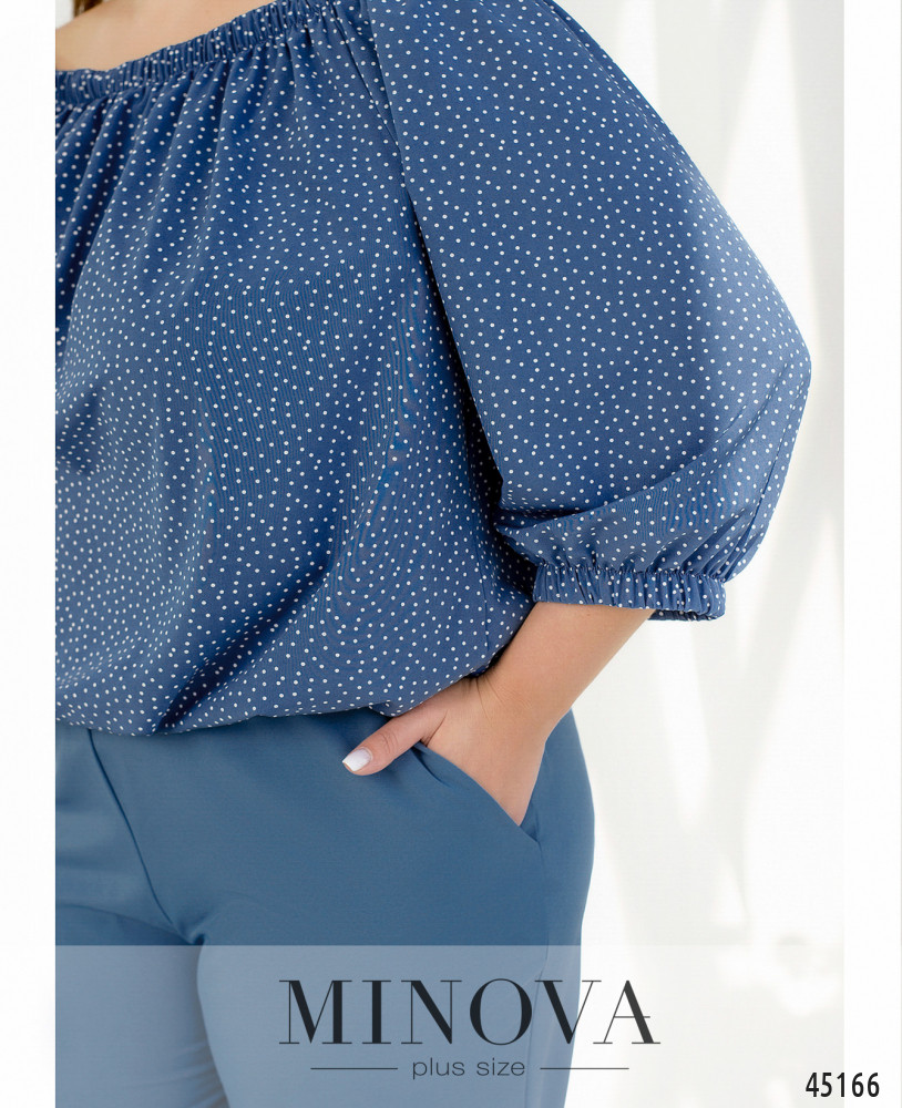 Яркий нарядный костюм из тонкой невесомой ткани создает идеальный образ в романтическом стиле. Воздушная блуза в горошек с объемными рукавами и вырезом-лодочкой, создающим изящную линию плеч, идеально сочетается с однотонными минималистичными брюками в тон на резинке с карманами. Благодаря резинкам, вшитым в горловину, подол и рукава, вы можете менять форму блузы и всегда выглядеть по-новому.