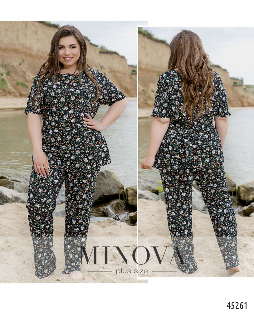 Яркий невесомый костюм с цветочным принтом выполнен из легкой натуральной ткани, позволяющей коже дышать. Универсальная блуза-туника прямого кроя с вырезом-лодочкой и завязками сзади, позволяющими сделать акцент на талии, дополнена брюки прямого кроя с карманами на резинке. Этот комплект идеально подходит для прогулок с друзьями или поездок за город.