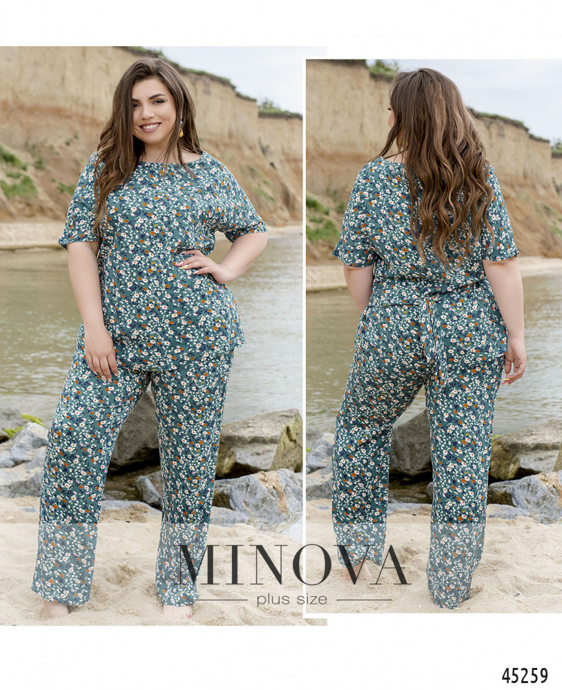 Яркий невесомый костюм с цветочным принтом выполнен из легкой натуральной ткани, позволяющей коже дышать. Универсальная блуза-туника прямого кроя с вырезом-лодочкой и завязками сзади, позволяющими сделать акцент на талии, дополнена брюки прямого кроя с карманами на резинке. Этот комплект идеально подходит для прогулок с друзьями или поездок за город.