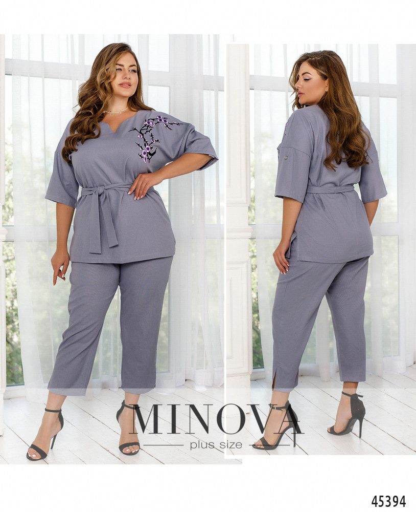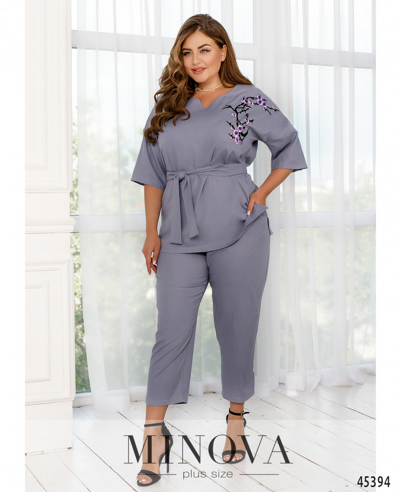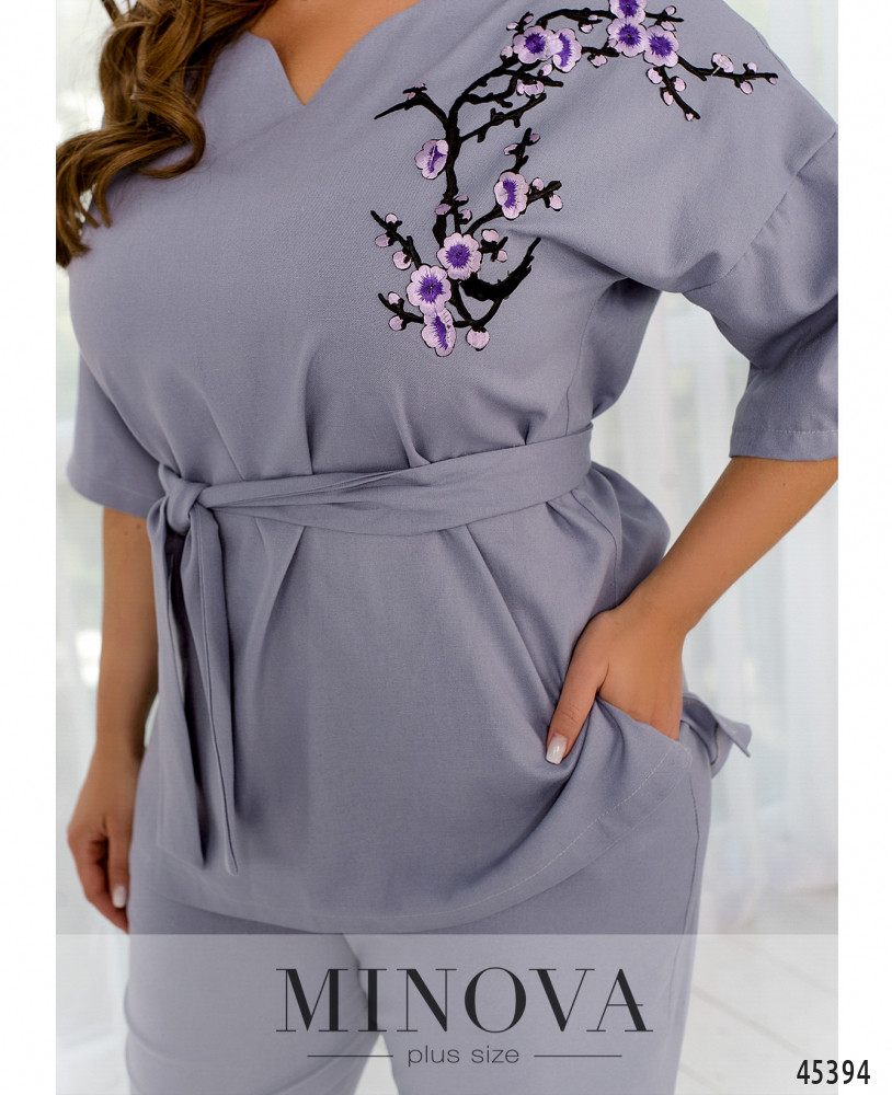 Элегантный костюм-двойка большого размера с блузой и брюками. Блуза украшена вышивкой на левой стороне груди. Вырез горловины полукруглый с углублением. Рукава с подшитой "регулировочной" лентой. По бокам на подоле разрезы. Без застёжек и карманов. Брюки с высокой талией, в пояс вшита резинка, по бокам врезные карманы, без манжет.