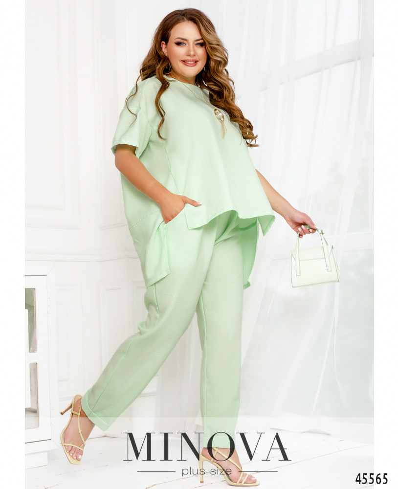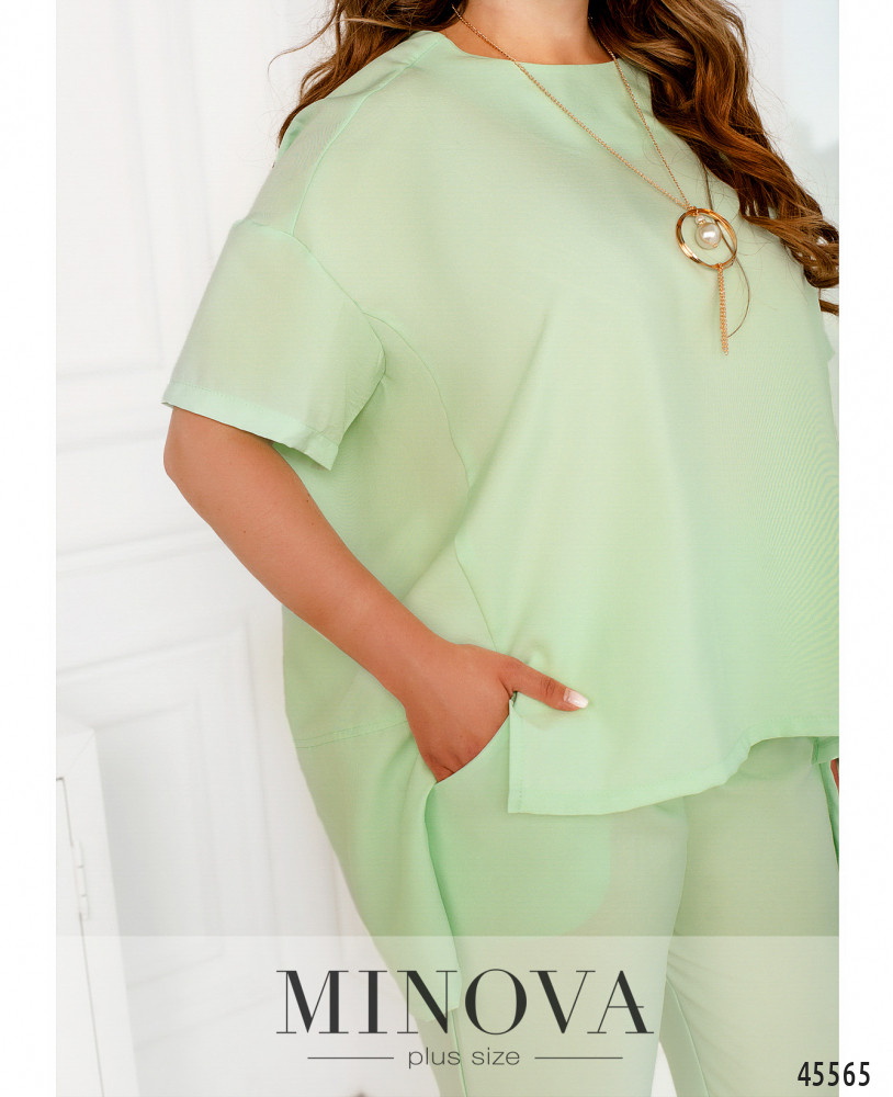 Стильный однотонный костюм, выполненный из легкой тонкой ткани – универсальное летнее решение для любой модницы. Он состоит из лаконичных брюк на резинке и блузы актуальной формы oversize. Брюки на резинке зауженной формы с манжетами дополнены декоративной ширинкой (имитацией), защипами спереди и карманами по бокам. Блуза свободного кроя обращает на себя внимание благодаря приспущенной линии плеч и ассиметричному подолу с разрезами.