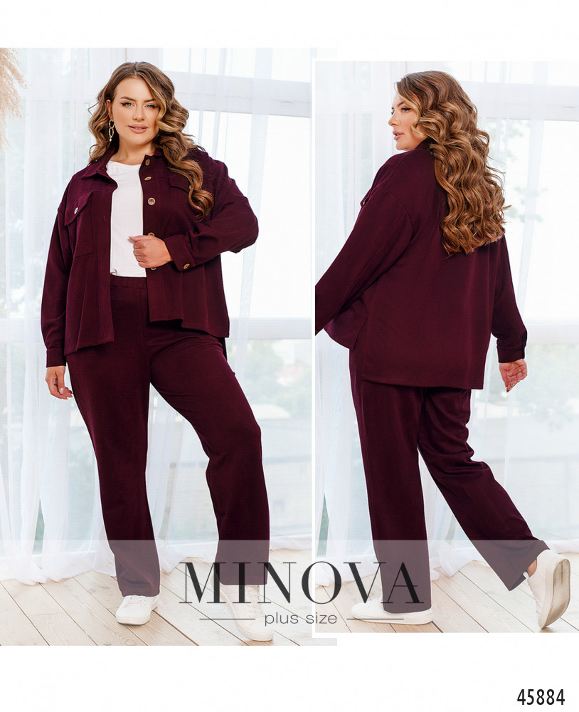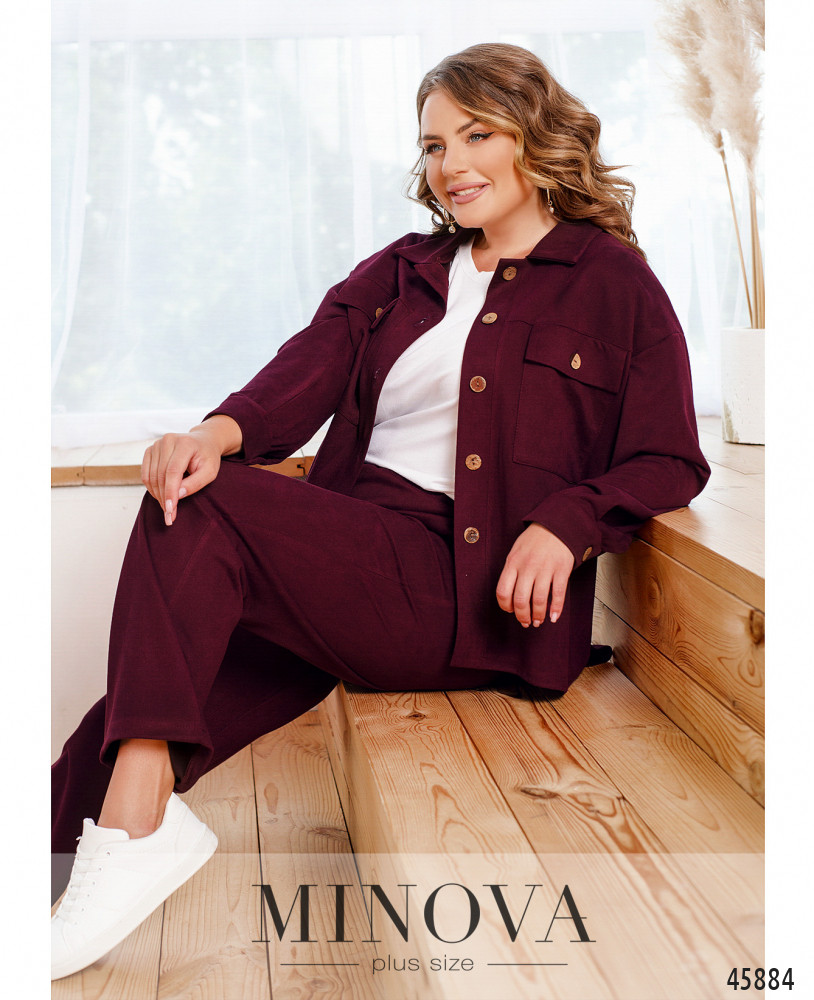 Привлекательный универсальный костюм с рубашкой и брюками можно носить вместе или разделить, создавая различные образы с другими вещами. В комплект входит рубашка с отложным воротничком, застегивающаяся на ряд пуговиц на планке спереди, с накладными карманами на груди и длинными рукава с манжетами. Костюм дополнен брюками с высокой посадкой и врезными карманами по бокам, в пояс которых вшита резинка.