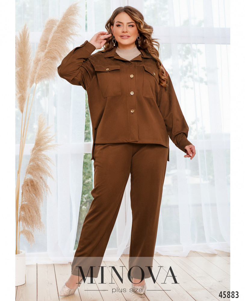 Привлекательный универсальный костюм с рубашкой и брюками можно носить вместе или разделить, создавая различные образы с другими вещами. В комплект входит рубашка с отложным воротничком, застегивающаяся на ряд пуговиц на планке спереди, с накладными карманами на груди и длинными рукава с манжетами. Костюм дополнен брюками с высокой посадкой и врезными карманами по бокам, в пояс которых вшита резинка.