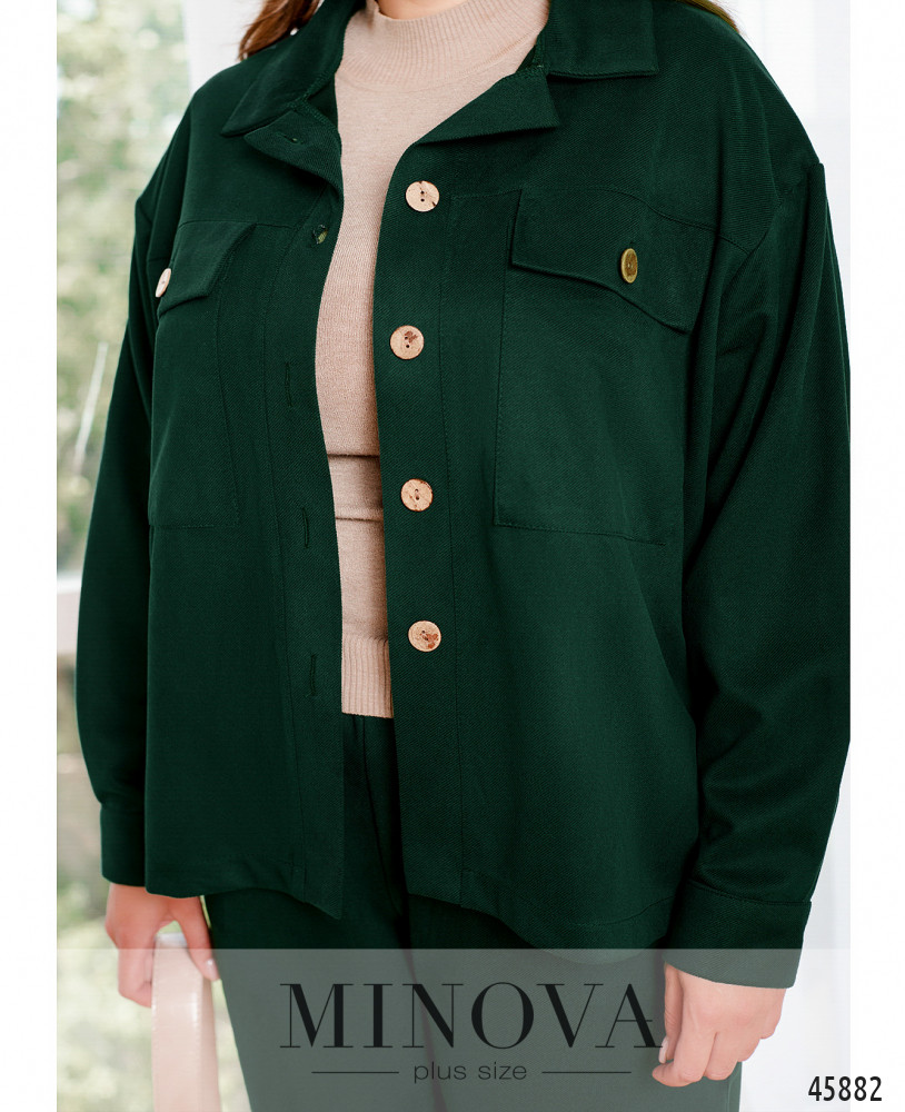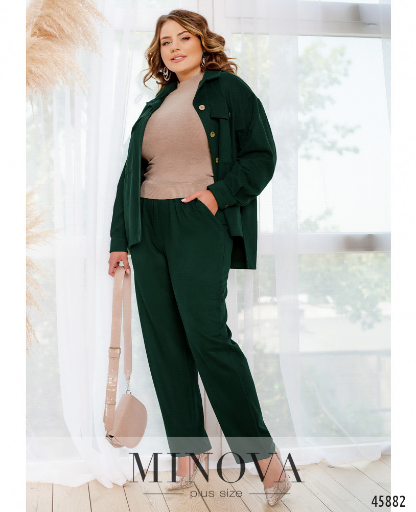 Привлекательный универсальный костюм с рубашкой и брюками можно носить вместе или разделить, создавая различные образы с другими вещами. В комплект входит рубашка с отложным воротничком, застегивающаяся на ряд пуговиц на планке спереди, с накладными карманами на груди и длинными рукава с манжетами. Костюм дополнен брюками с высокой посадкой и врезными карманами по бокам, в пояс которых вшита резинка.