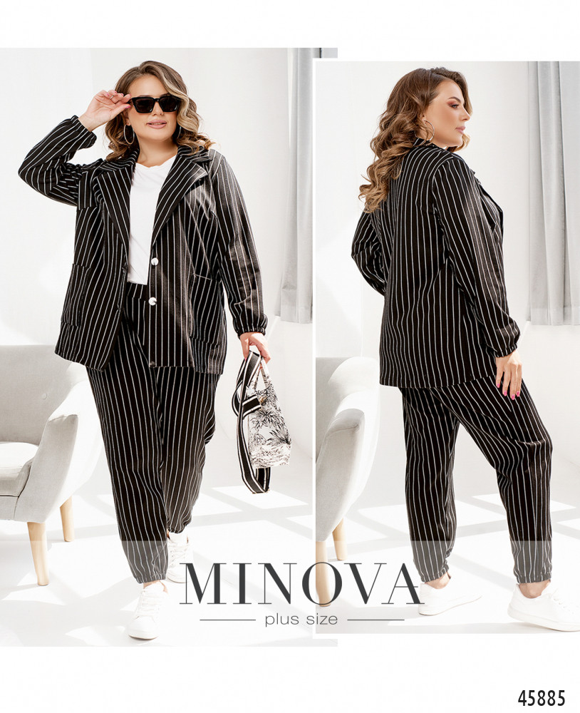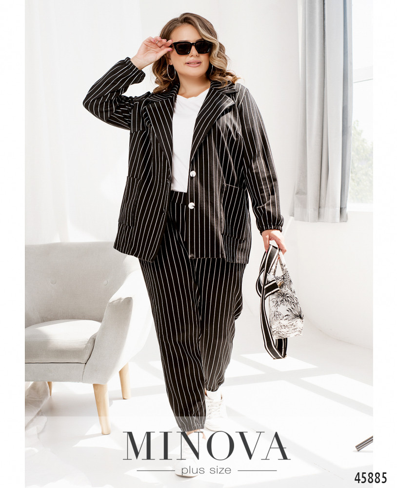 Этот деловой костюм в полоску с элементами в стиле casual может составить основу всего гардероба. Классический однобортный жакет без подкладки, застегивающийся на пуговицы, дополнен накладными карманами и резинкой на рукавах вместо манжет. В комплект также входят брюки с карманами в боковых швах и резинками, вшитыми по линии талии и на штанинах внизу.