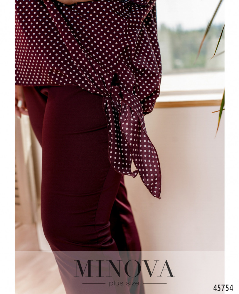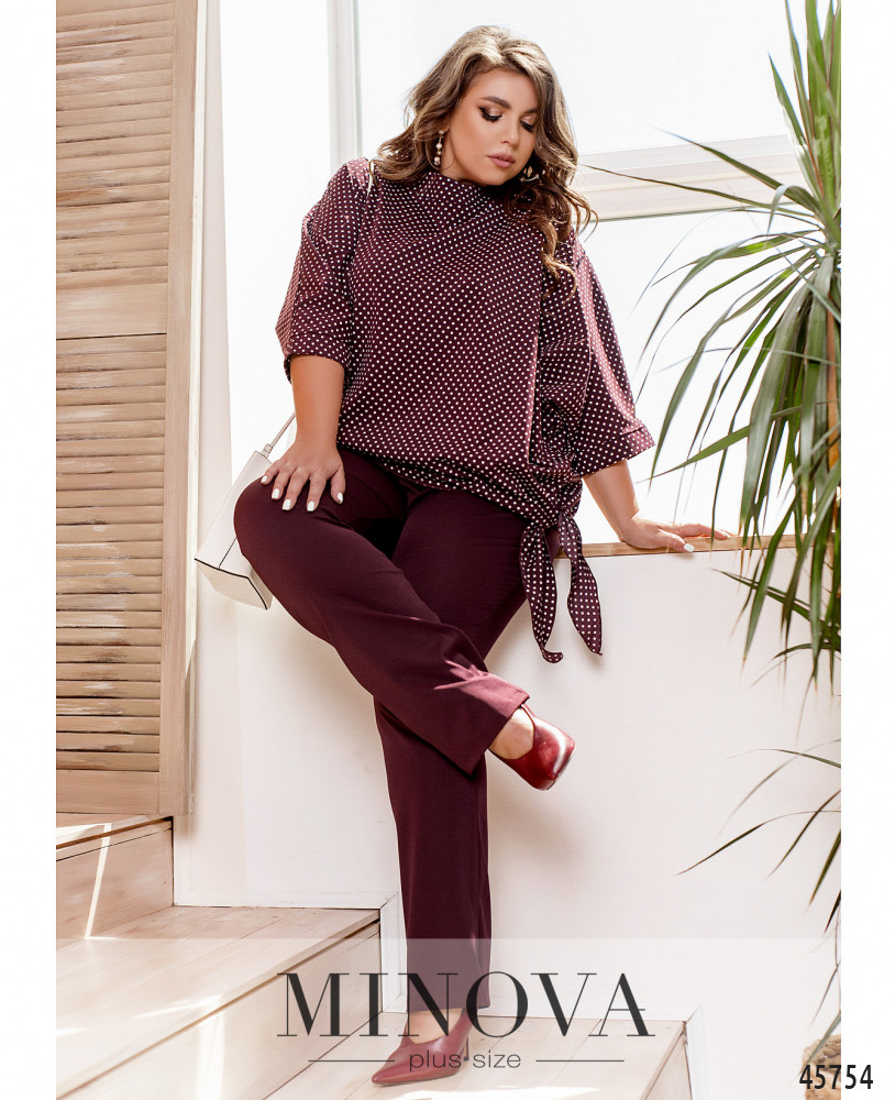 Яркий стильный костюм, состоящий из блузы и брюк, – универсальное решение для любой модницы. Воздушная выразительная блуза с рукавами "летучая мышь" длиной 3/4 и маленьким воротником-стойкой идеально дополнена лаконичными однотонными брюками прямого кроя с карманами и резинкой, вшитой по линии талии.