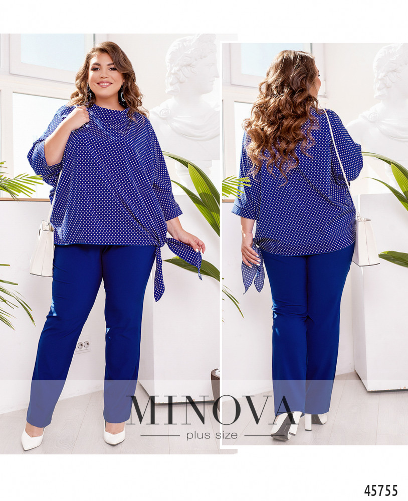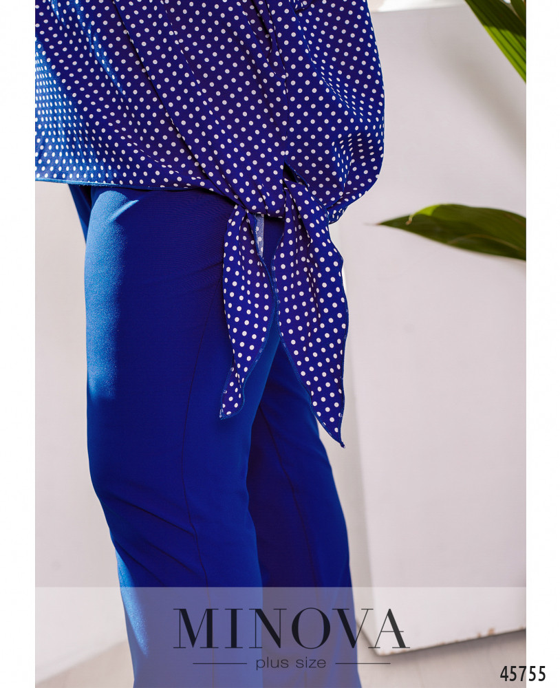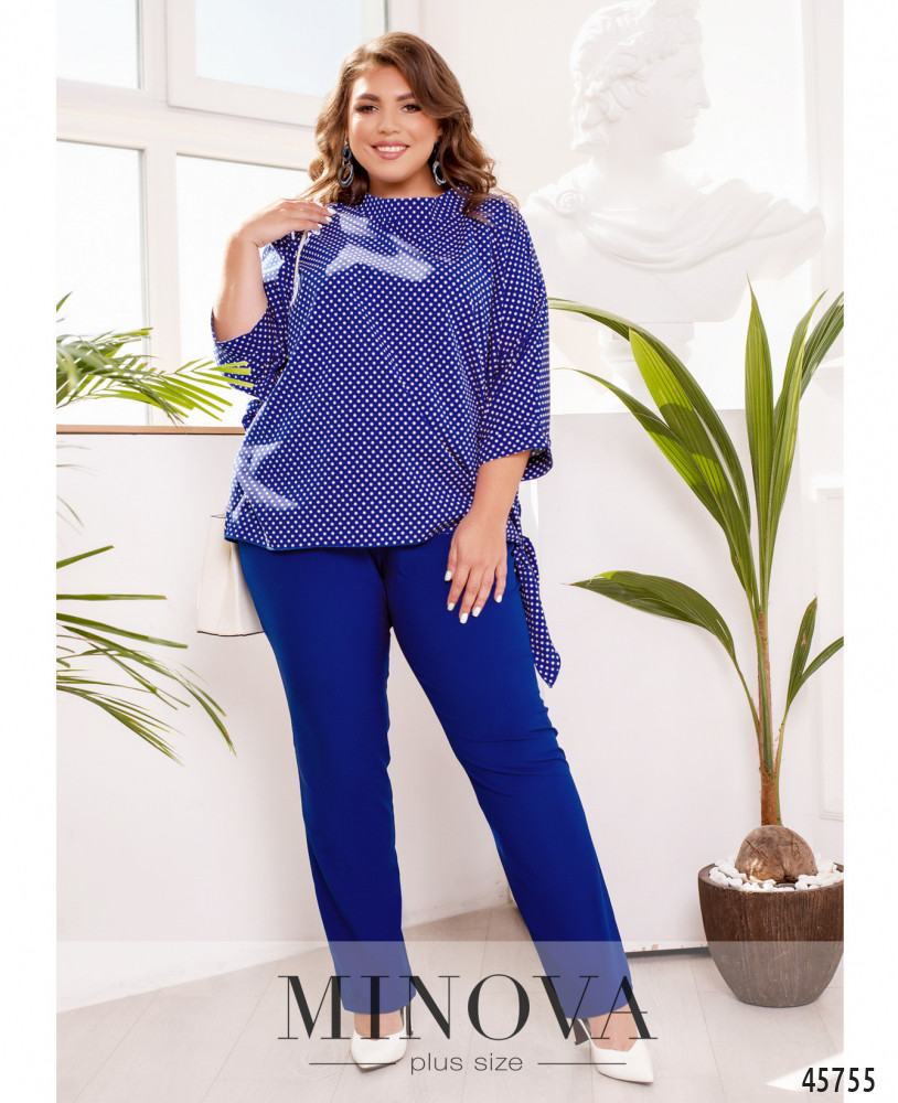 Яркий стильный костюм, состоящий из блузы и брюк, – универсальное решение для любой модницы. Воздушная выразительная блуза с рукавами "летучая мышь" длиной 3/4 и маленьким воротником-стойкой идеально дополнена лаконичными однотонными брюками прямого кроя с карманами и резинкой, вшитой по линии талии.